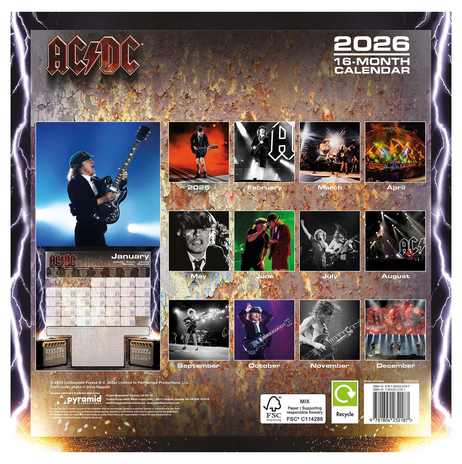 AC/DC oficjalny kalendarz na ścianę na 2026 rok Numer katalogowy: C2402826 Producent: Pyramid International Oryginalny i licencjonowany kalendarz, posiada 12 rozkładanych stron o wymiarach 30x60 cm. Na każdej z kart znajduje się duża fotografia oraz czytelne kalendarium z miejscem na notatki. W kalendarzu znajduje się 12 unikalnych zdjęć dla każdego miesiąca. Okładki wykonane są z papieru powlekanego matowego i laminowanego o gramaturze 250 g/m2, wnętrze z papieru powlekanego matowego o gramaturze 150 g/m2. Nagłówki są w 6 językach: angielski, hiszpański, francuski, włoski, niemiecki i polski. Oprawa zszywkowa. Złożony kalendarz 30x30 cm. Rozłożony kalendarz 30x60 cm. Zawiera otwór 5 mm do zawieszenia na ścianie.