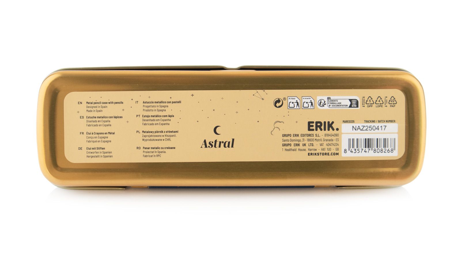 Astral - piórnik metalowy Numer katalogowy: MARE0335 Producent: Grupo Erik Wymiary: 21 × 8,5 × 2,5 cm Metalowy piórnik z serii Astral z zestawem kredek / miejsca na przybory. Wykonanie z metalu daje solidność i ochronę dla zawartości; piórnik jest cienki i smukły, można go łatwo schować w plecaku lub torbie. Pokrywa dobrze przylega, zamek działa gładko; grafika wyróżnia się minimalistycznym stylem, estetyka pasuje do zarówno młodszych użytkowników, jak i tych którzy cenią prostotę. Szczegóły techniczne Materiał: metal Pojemność: zestaw kredek / miejsce na przybory Motyw: Astral Oryginalny produkt na oficjalnej licencji Grupo Erik.