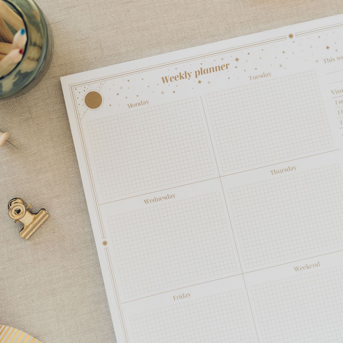 Tygodniowy planer Astral Planer A4 z ulubionym motywem w któym zaplanujesz cały tydzień. Planer zadrukowany jestkolorowymi grafikamizwiązanymi z głównym motywem. Ma dużo miejsca na notatki na każdy dzień tygodnia. Arkusze są przyklejone na krótkim boku (orientacja pozioma) i nie mają okładki. Tooryginalny produktposiadający licencję producenta. Szczegóły techniczne Wymiary planera:29,7x21 cm