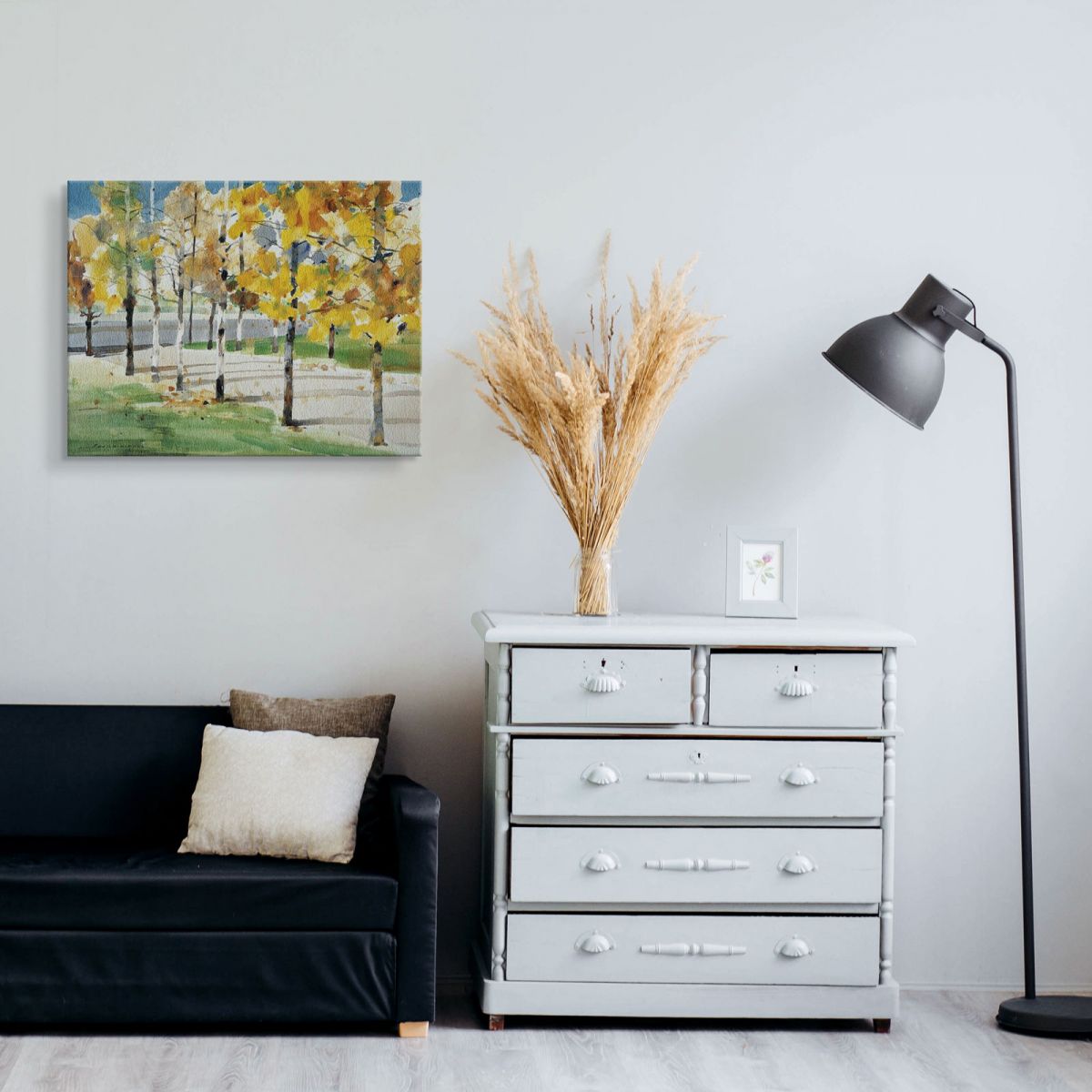 Obraz na ścianę noszący nazwę Autumn Trees. Autorstwa: Law Wai Hin Szukasz oryginalnej, ekskluzywnej dekoracji na ścianę? Ten obraz jest dla Ciebie! fantastyczne kolory i rewelacyjna ostrość., obrazy charakteryzuje wysokie nasycenie barw i ostrość, nie sposób oderwać od nich wzrok. Kolory utrzymują się przez długie lata. Mocne bawełniane płótno wygląda naturalnie i oddaje charakter autentyczności obrazu.