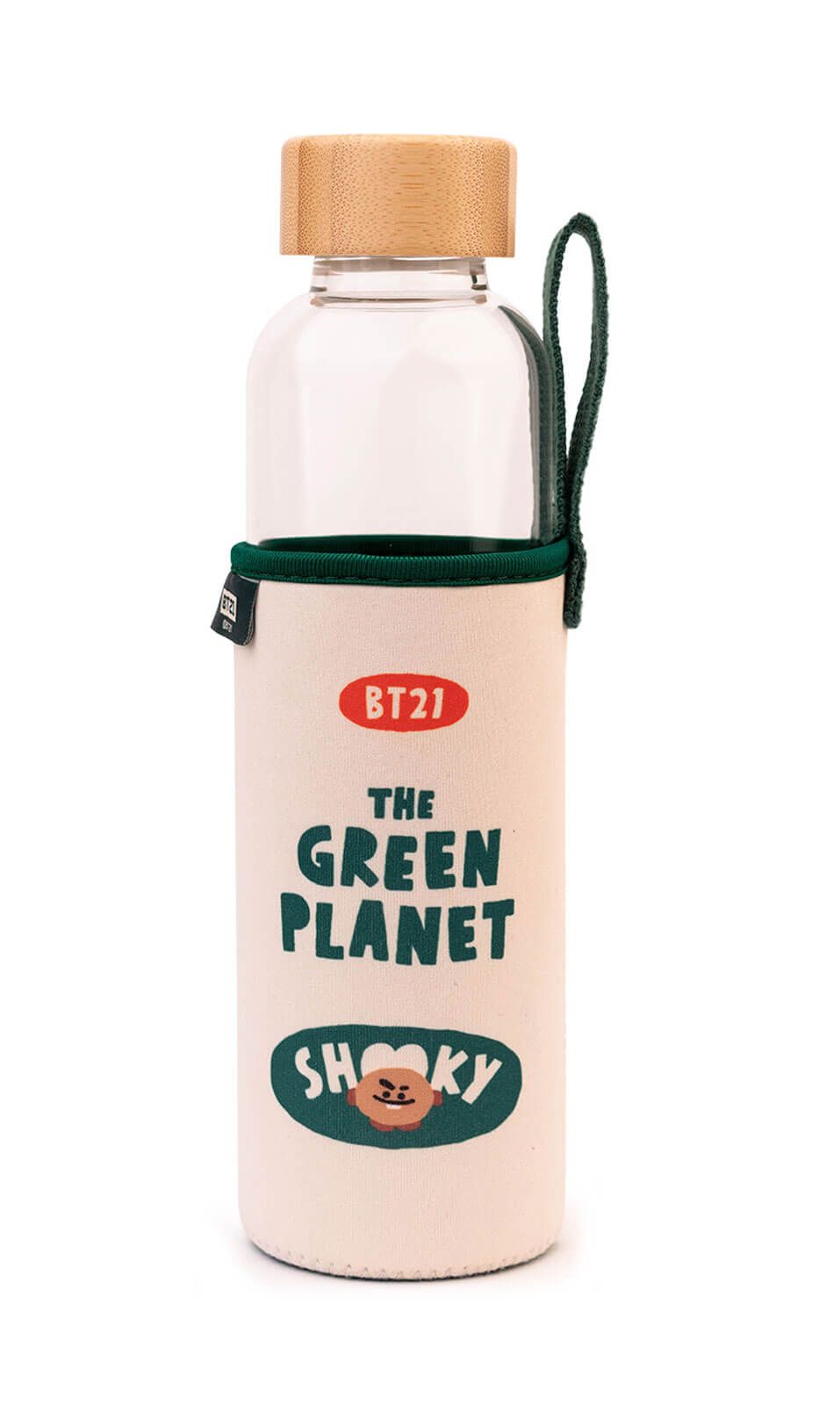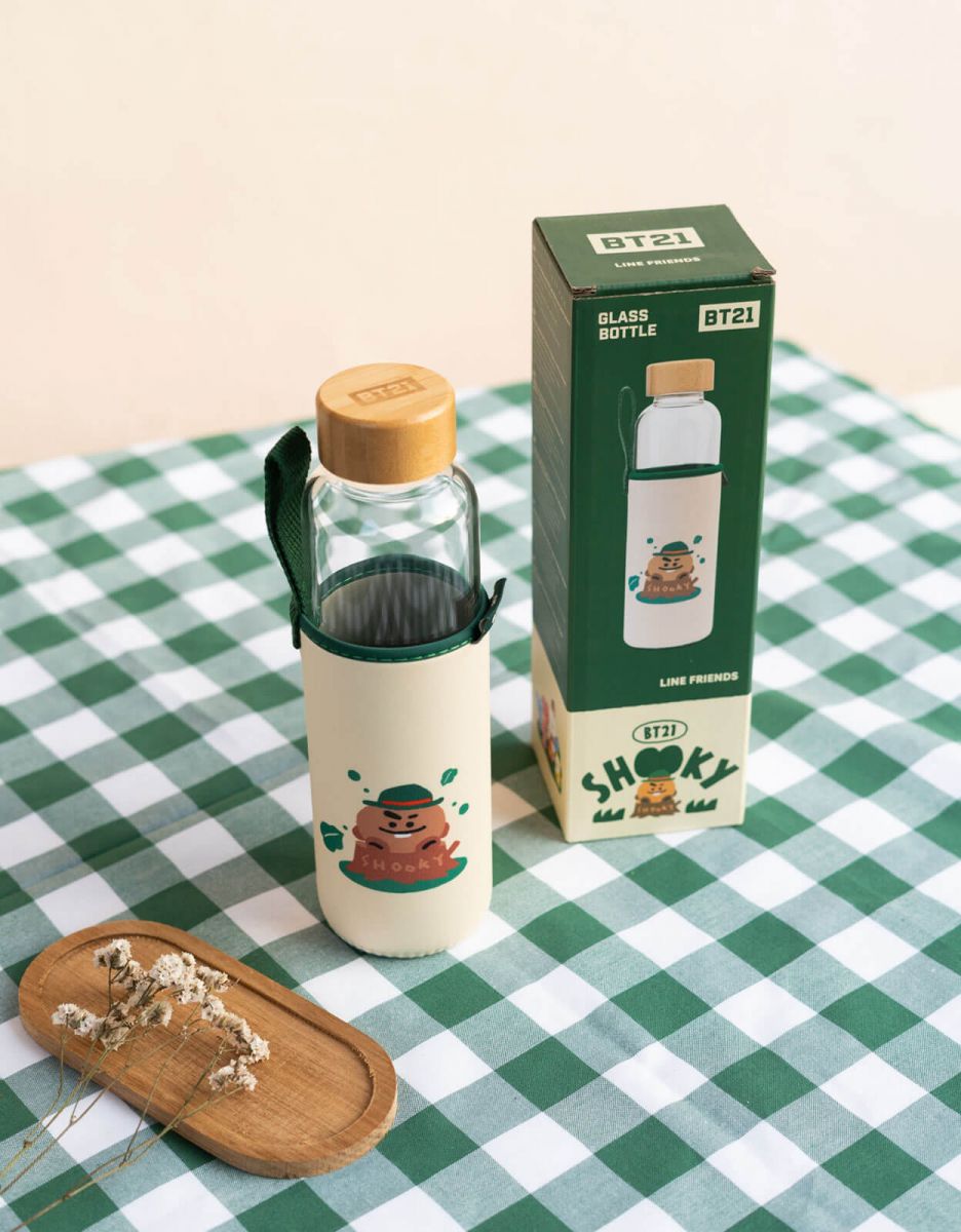 Butelka ze szkła BT21 Shooky Wybierając szklanąeco butelkę wielokrotnego użytku dbasz o nasze środowisko. Butelka na napoje z oryginalnymmotywem jest świetnym gadżetem dla każdego fana. Wykonana ze szkłaborokrzemianowego. Pojemność 500 ml. Marka: Grupoerik