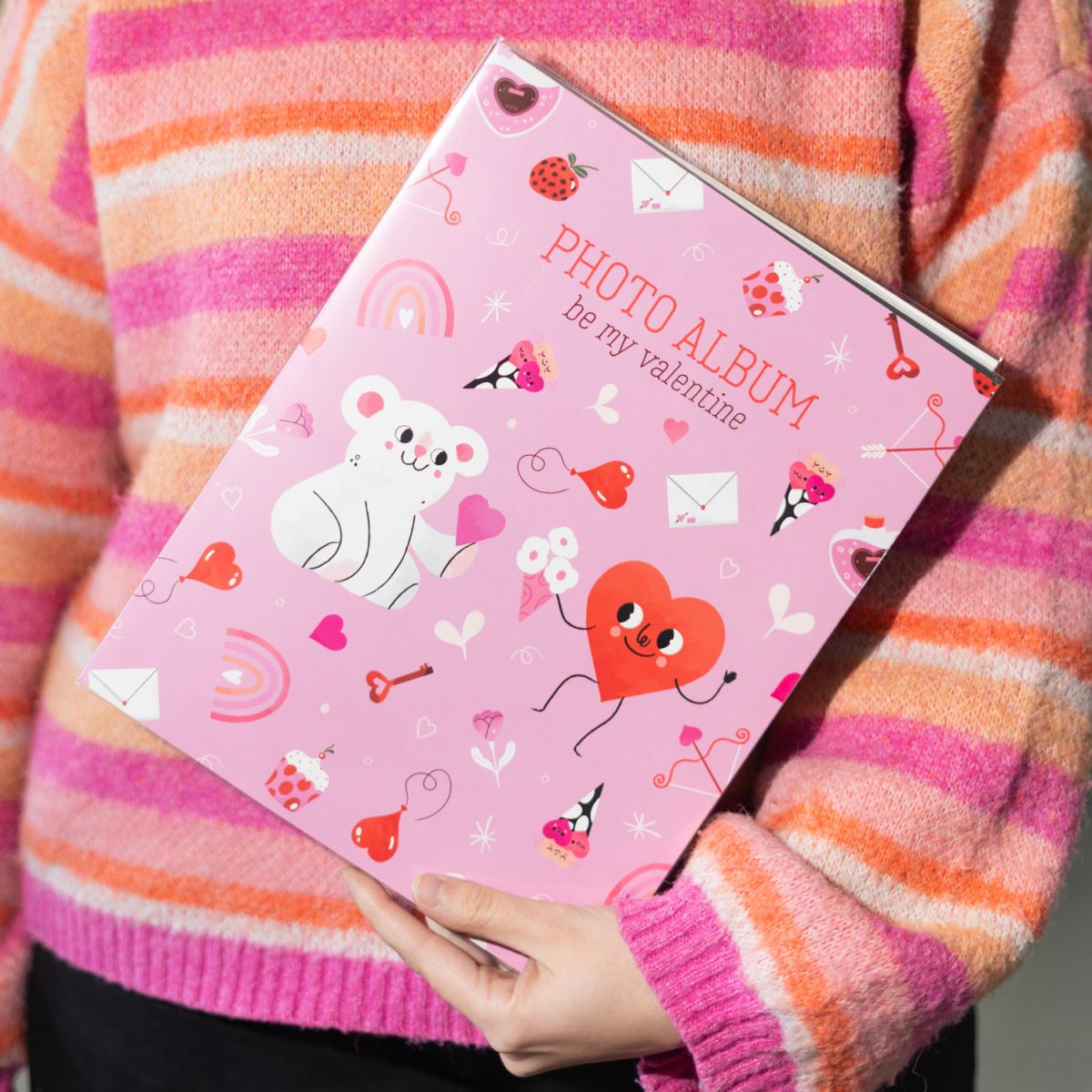 Be My Valentine - Album na zdjęcia Album w miękkiej okładce zabezpieczony foliową obwolutą. Jego strony posiadają kieszonkę z folii, która ułatwia umieszczanie fotografii. Album posiada 48 stron, na których umieścić możesz 96 zdjęć w rozmiarze: 13x20 cm, 13x18 cm, 10x15 cm, INSTAX, POLAROID Szczegóły techniczne: Wymiary zewnętrzne: 22x28 cm Wymiary strony: 21,5x27 cm Okładka: miękka, tworzywo sztuczne Karty: miękkie, tworzywo sztuczne, kieszenie Rodzaj albumu: zdjęcia wsuwane Wykończenie albumu: klejony Kolor kart: czarny Oryginalny design: Romantyczny album, doskonały na wyjątkowe wspomnienia.