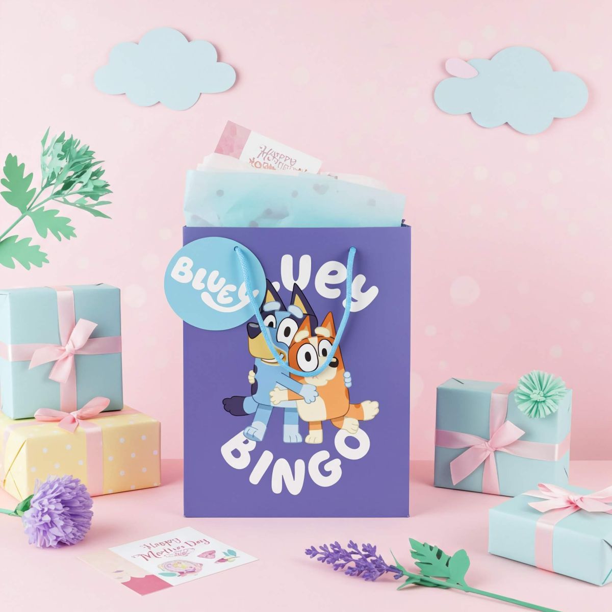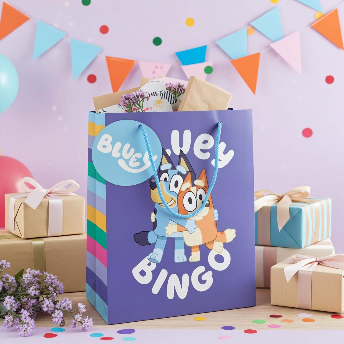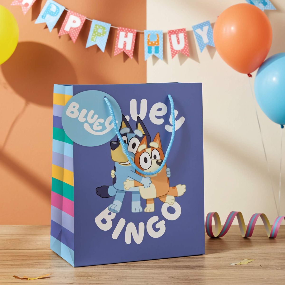 Torebka na prezent Bluey i Bingo Duża torebka ozdobna z motywem Bluey i Bingo. Format 26 x 33 cm pozwala na zapakowanie większych prezentów. Wykonana z papieru o podwyższonej wytrzymałości, posiada winietkę na imię obdarowanego. Atrakcyjny produkt dla dziecięcych okazji. Szczegóły techniczne: Wymiary: 26 x 33 cm Materiał: papier Motyw: Bluey i Bingo Dodatki: winietka Licencjonowany produkt Licencjonowana torebka Bluey - oryginalny produkt do sprzedaży detalicznej i hurtowej.