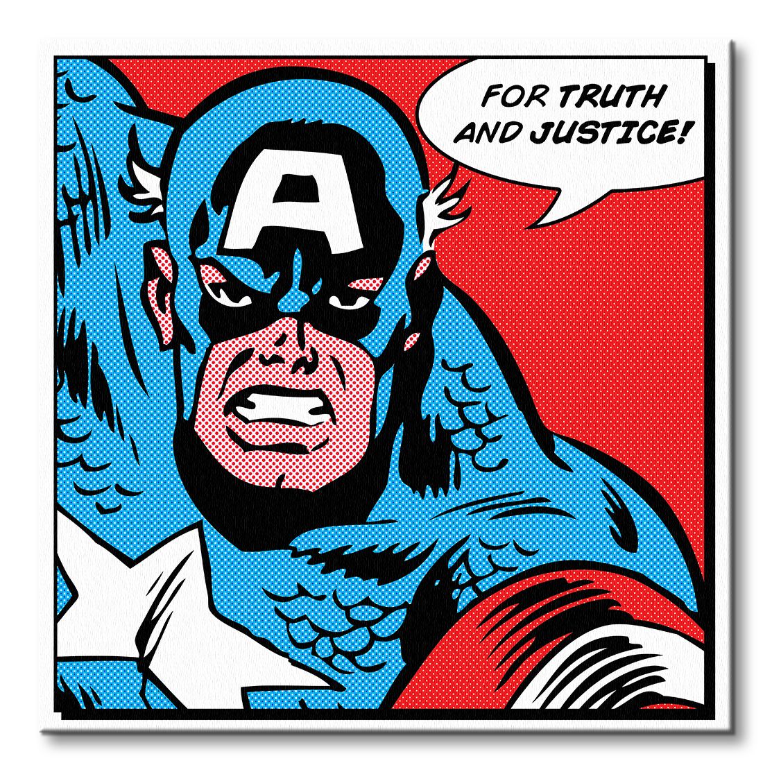 Obraz na ścianę noszący nazwę Captain America (For Truth and Justice). Autorstwa: nieznany Szukasz oryginalnego obrazu na ścianę? Wybierz jeden z naszej kolekcji! nasycone kolory i doskonała jakość., obrazy charakteryzuje wysokie nasycenie barw i ostrość, nie sposób oderwać od nich wzrok. Dzięki lakierowanej powierzchni kolory pozostają żywe przed długi czas. Mocne bawełniane płótno wygląda naturalnie i oddaje charakter autentyczności obrazu.
