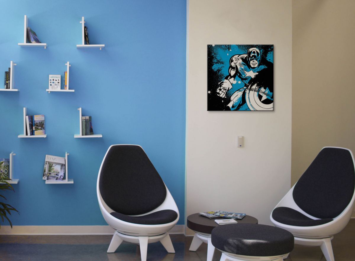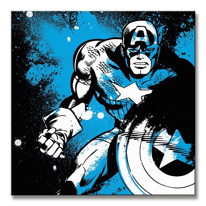 Obraz na ścianę noszący nazwę Captain America (Splatter). Szukasz oryginalnej, ekskluzywnej dekoracji na ścianę? Ten obraz jest dla Ciebie! wyraziste barwy i doskonała ostrość nadruku., obrazy charakteryzuje wysokie nasycenie barw i ostrość, nie sposób oderwać od nich wzrok. Kolory utrzymują się przez długie lata. Mocne bawełniane płótno wygląda naturalnie i oddaje charakter autentyczności obrazu.