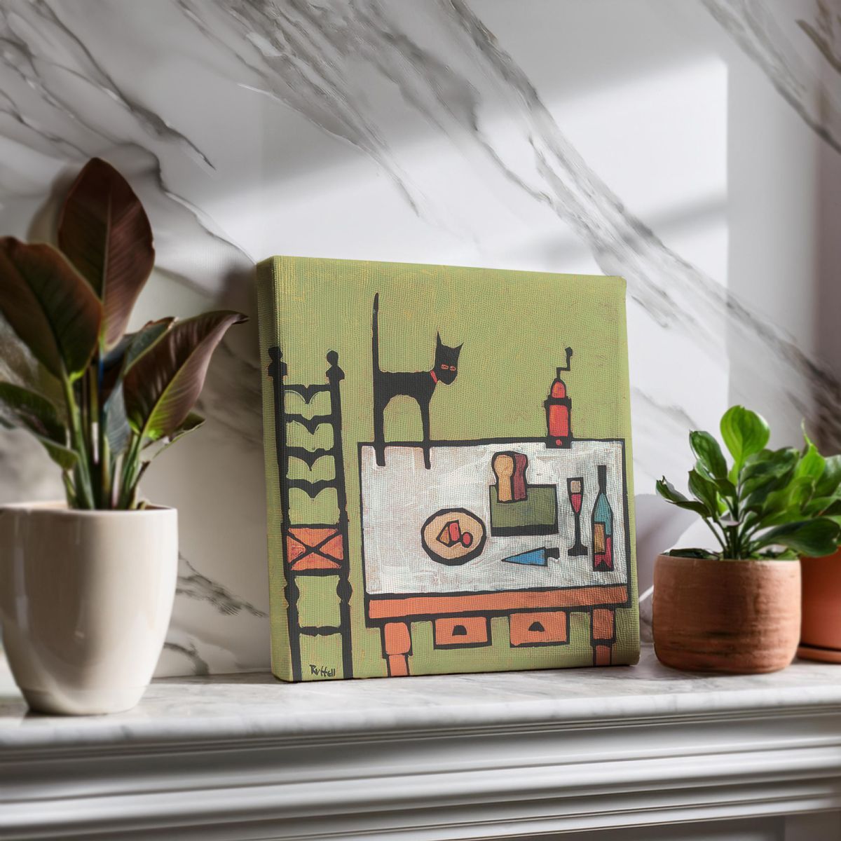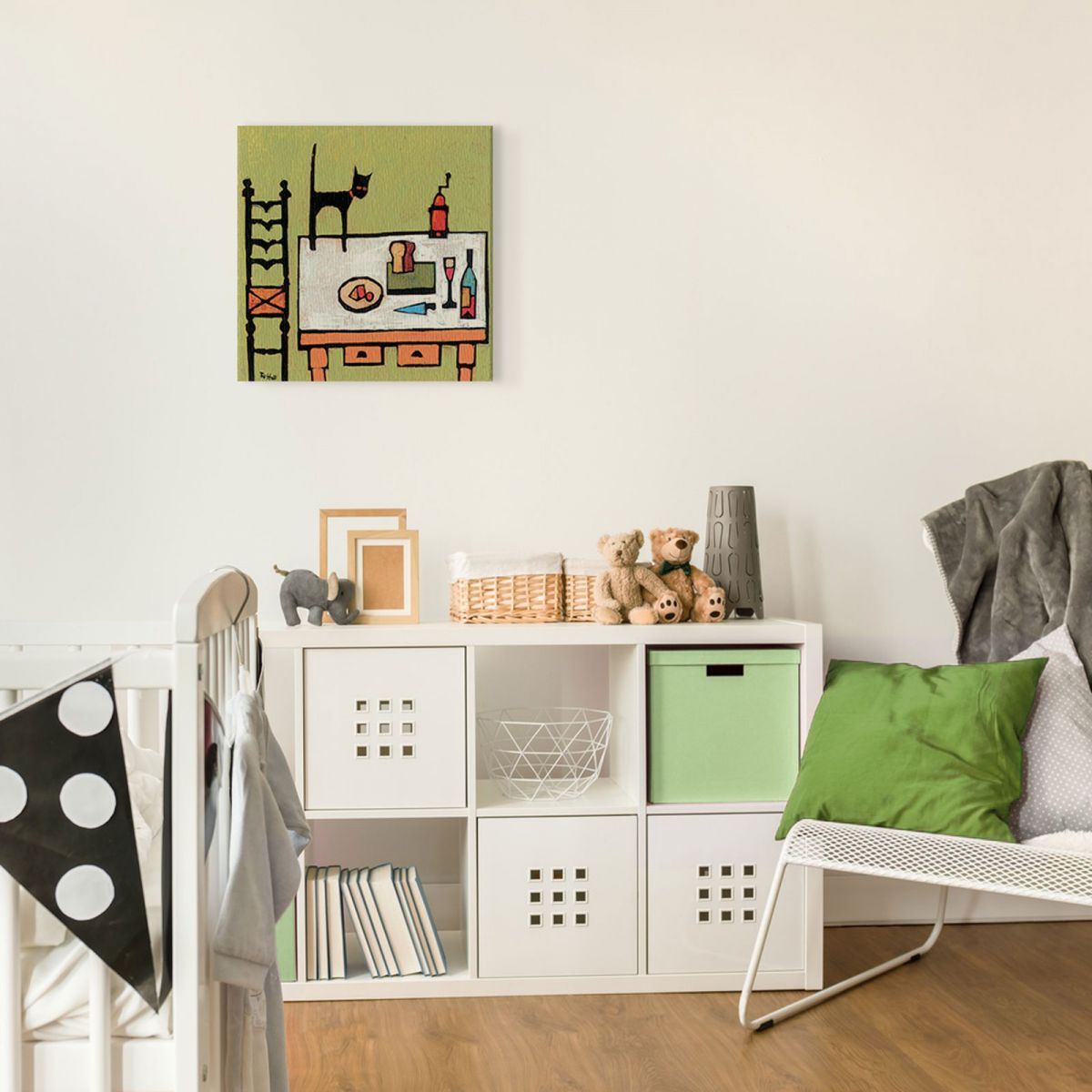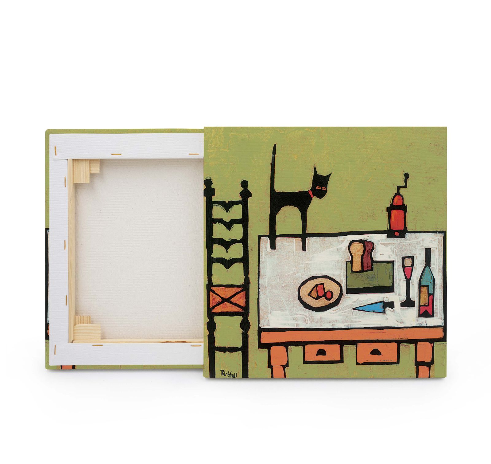 Cat On Table obraz na płótnie naciągnięty na sosnowe krosna. Zakupiony obraz jest gotowy do powieszenia na ścianie. Nasze produkty wykonywane są z dużą starannością oraz dbałością o szczegóły. Obraz posiada zadrukowane boki co gwarantuje estetyczne wykończenie bez konieczności dodatkowego oprawiania go.