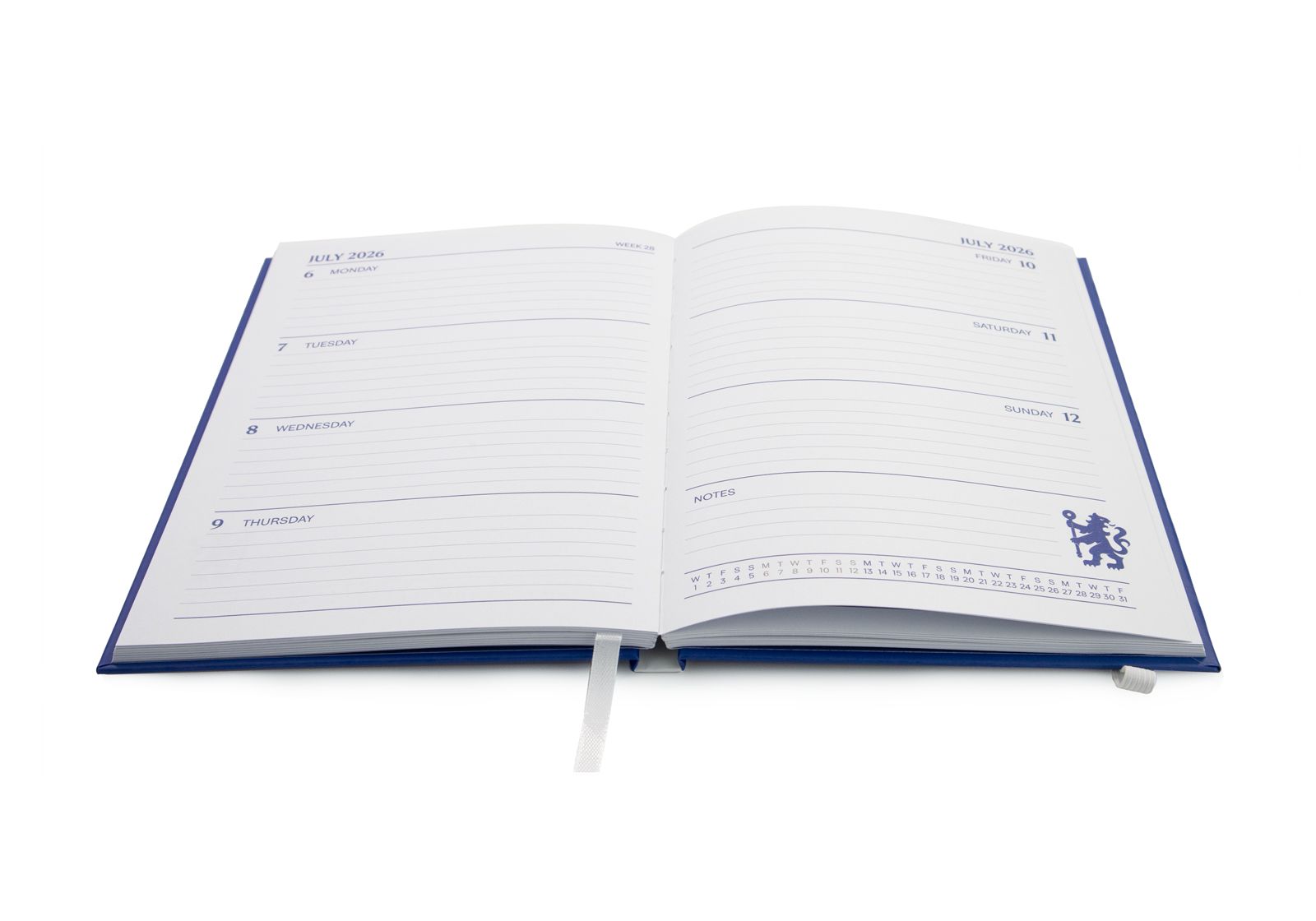 Chelsea FC kalendarz książkowy A5 2026 Licencjonowany kalendarz książkowy A5 z motywami Chelsea FC. Twarda oprawa, układ tygodniowy, przeglądy miesięczne oraz miejsce na zapiski idealny dla sklepów sportowych i fan-storeów. Format: A5 (ok. 14,8 × 21 cm) Układ: tygodniowy z przeglądami miesięcznymi Ilość stron: 146 Okładka: twarda Oficjalna licencja Chelsea FC