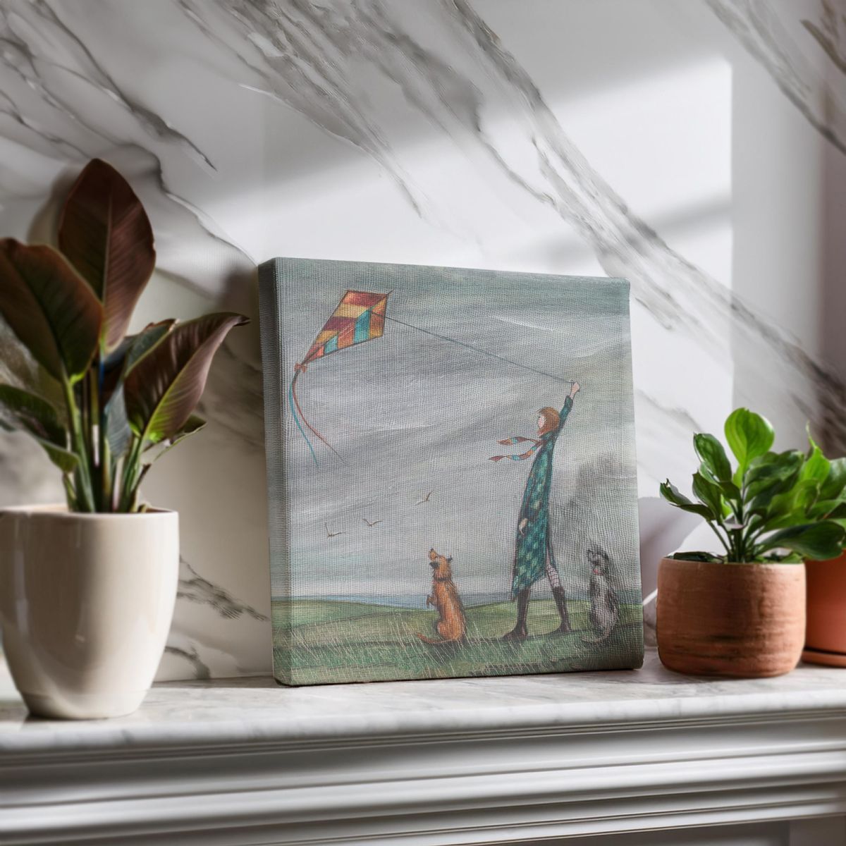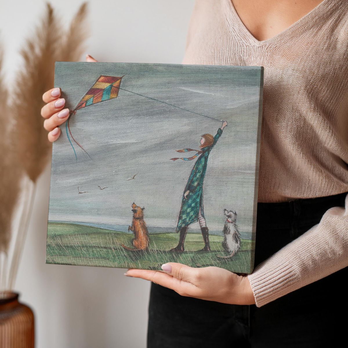 "Dancing In The Wind" to piękny obraz, który uchwyca moment zabawy na wietrznym polu. Postać z psem puszcza kolorowy latawiec, tworząc radosną i beztroską kompozycję. Delikatne odcienie zieleni i szarości oraz żywe barwy latawca tworzą harmonijną całość. Wykonany techniką akrylu na płótnie, obraz charakteryzuje się trwałością i głębią kolorów. Doskonały jako dekoracja do nowoczesnych wnętrz, wprowadzając element przygody i świeżości. Produkt jest oryginalny i posiada licencję producenta, co potwierdza jego wysoką jakość i unikalność. Obraz na płótnie typu canvas. Sosnowe krosna. Zakupiony obraz jest gotowy do powieszenia na ścianie. Dzięki starannemu wykonaniu i dbałości o detale otrzymujesz obraz najlepszej jakości.Obraz jest ostry a barwy nasycone. Nie ma konieczności oprawiania obrazu ponieważ jego boki również są zadrukowane. Płótno jest trwałe i posiada interesującą fakturę. Gruba sosnowa Blejtrama.