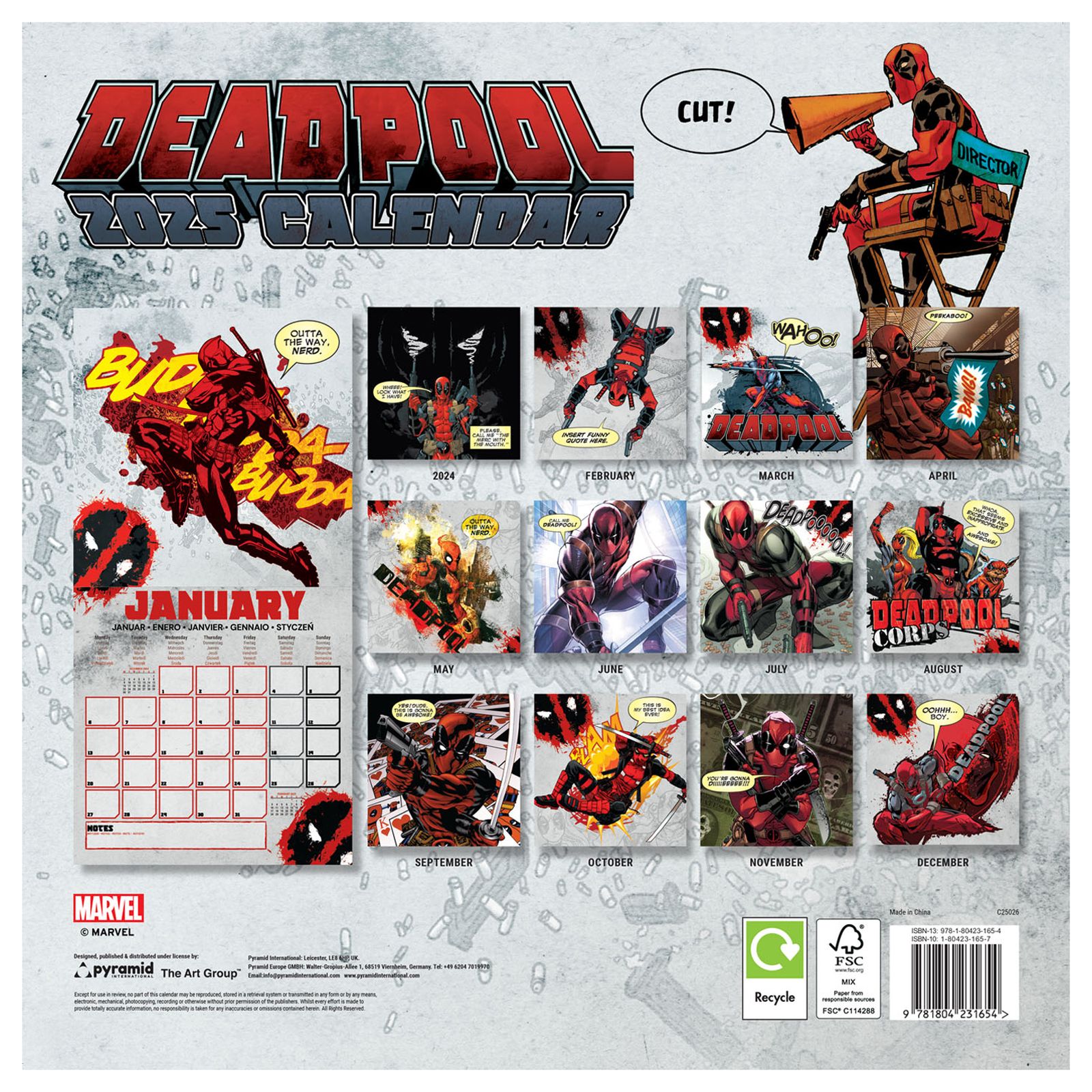 Deadpool oficjalny kalendarz na ścianę na 2025rok Oryginalny i licencjonowany kalendarz, posiada 12 rozkładanych stron o wymiarach 30x60 cm. Na każdej z kart znajduje się duża fotografiaoraz czytelne kalendarium z miejscem na notatki. Okładki wykonane są z papieru powlekanego matowego i laminowanego o gramaturze 250 g/m2, wnętrze z papieru powlekanego matowego o gramaturze 150 g/m2. Nagłówki są języku angielskim, niemieckim, hiszpańskim, francuskim, włoskim i polskim. Oprawa zszywkowa. Złożony kalendarz 30x30 cm. Rozłożony kalendarz 30x60 cm. Zawiera otwór 5 mm do zawieszenia na ścianie.