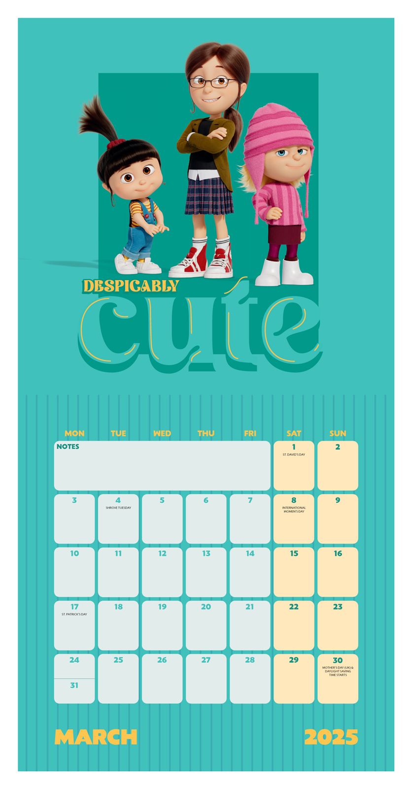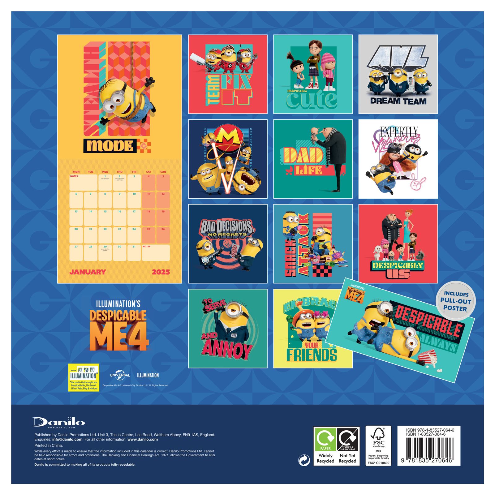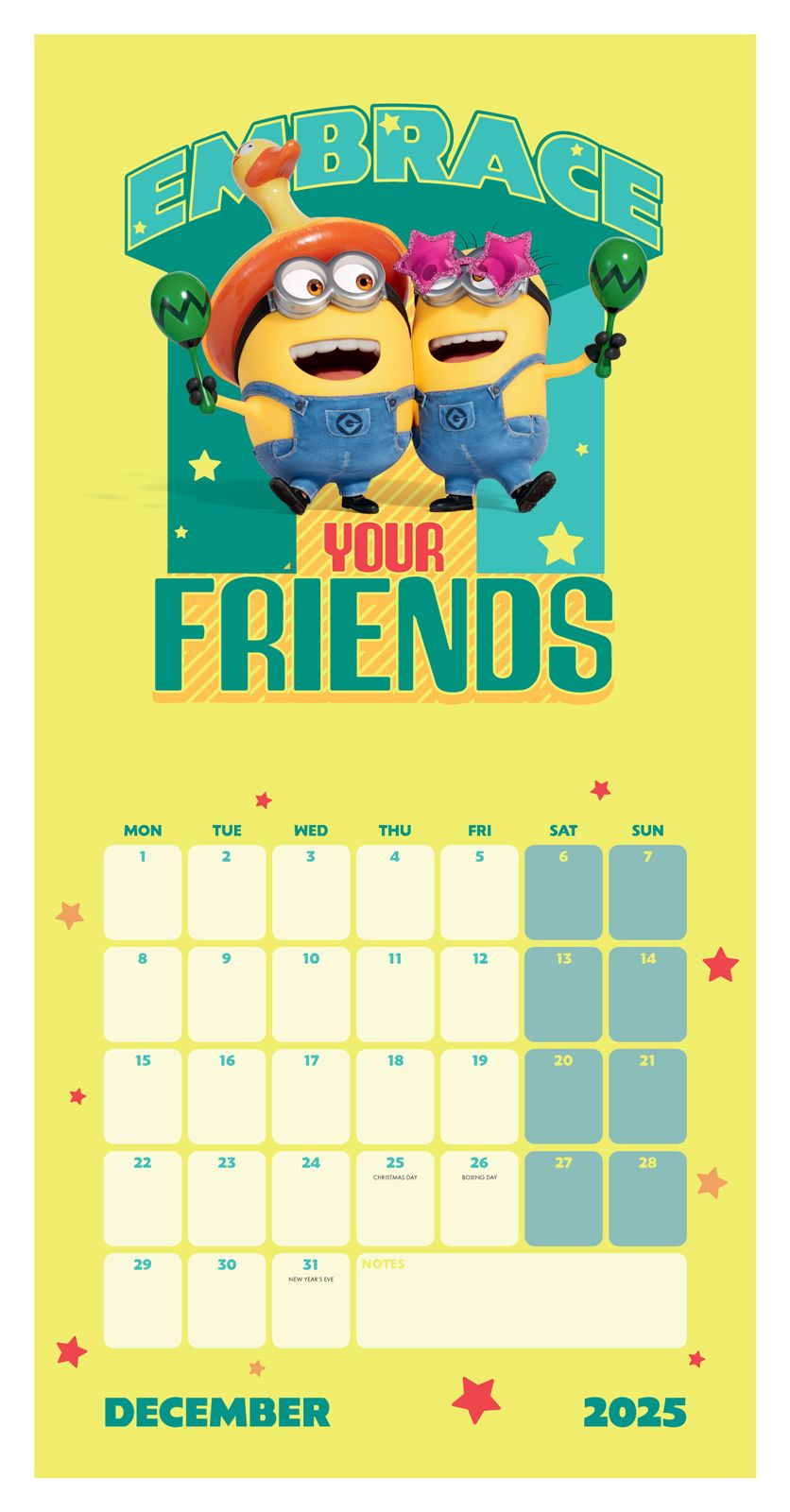 Minionki pod Przykrywką oficjalny kalendarz na ścianę na 2025rok Oryginalny i licencjonowany kalendarz, posiada 12 rozkładanych stron o wymiarach 30x60 cm. Na każdej z kart znajduje się duża fotografiaoraz czytelne kalendarium z miejscem na notatki. Okładki wykonane są z papieru powlekanego matowego i laminowanego o gramaturze 250 g/m2, wnętrze z papieru powlekanego matowego o gramaturze 150 g/m2. Nagłówki są w języku angielskim. Oprawa zszywkowa. Złożony kalendarz 30x30 cm. Rozłożony kalendarz 30x60 cm. Zawiera otwór 5 mm do zawieszenia na ścianie.