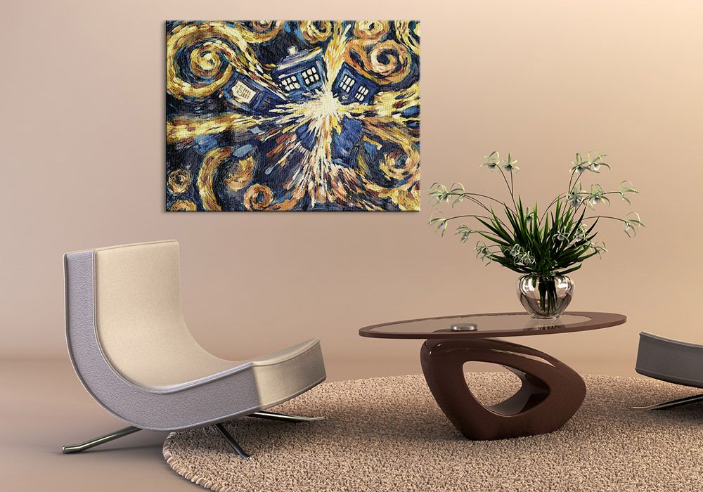 Obraz na ścianę noszący nazwę Doctor Who (Exploding TARDIS). Szukasz oryginalnej, ekskluzywnej dekoracji na ścianę? Ten obraz jest dla Ciebie! nasycone kolory i doskonała jakość., obrazy charakteryzuje wysokie nasycenie barw i ostrość, nie sposób oderwać od nich wzrok. Kolory utrzymują się przez długie lata. Bawełniane płótno wysokiej jakości gwarantuje świetne odwzorowanie i trwałość obrazu.