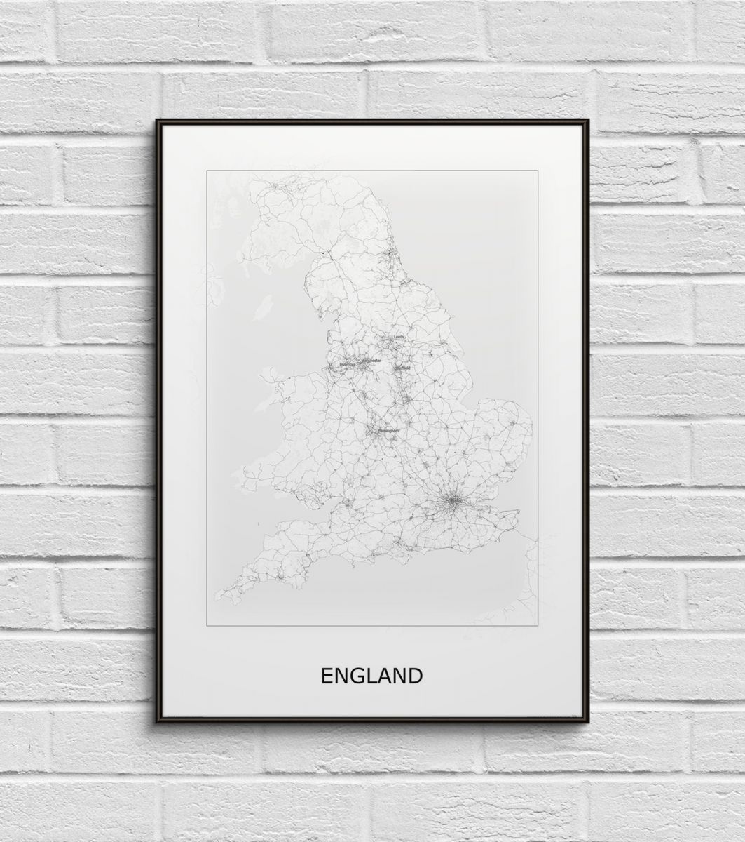 Plakat z mapą na ścianę, zatytułowany England, black&white Ciekawa i oryginalna mapa na ścianę. Wyprodukowany na papierze o wysokiej gramaturze w cyfrowej jakości. Mapy wykonane przez polskiego producenta. Świetnie nadają się do oprawienia w ramy lub antyramy. Specyfikacja papier satynowy 220g/m2 druk cyfrowy wymiary map 50x70 cm