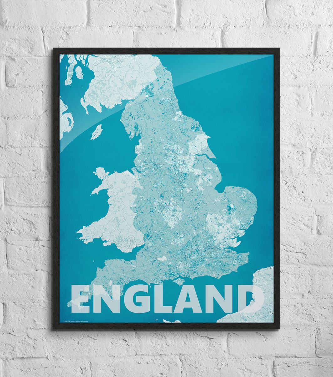 Plakat z mapą na ścianę, zatytułowany England, modern blue Ciekawa i oryginalna mapa na ścianę. Wyprodukowany na papierze o wysokiej gramaturze w cyfrowej jakości. Mapy wykonane przez polskiego producenta. Świetnie nadają się do oprawienia w ramy lub antyramy. Specyfikacja papier satynowy 220g/m2 druk cyfrowy wymiary map 40x50 cm