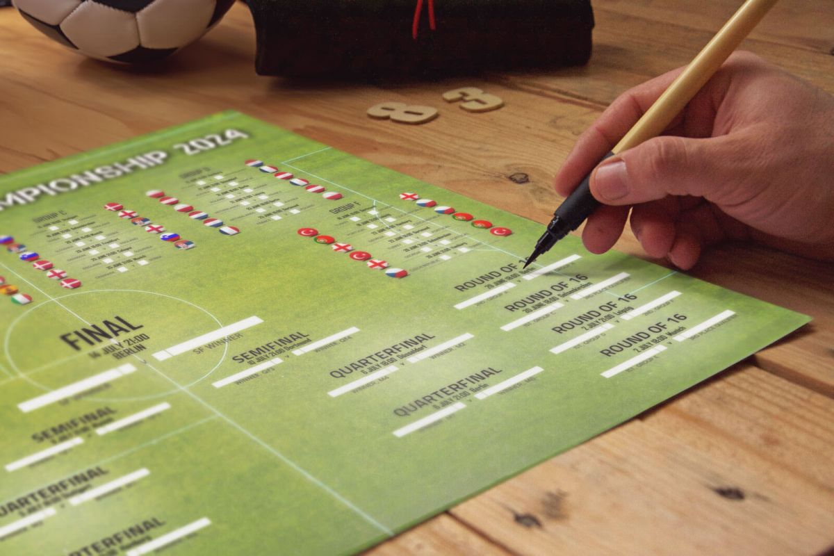 Tabela Euro 2024 terminarz rozgrywek na plakacie Plakat z tabelą rozgrywek wszystkich 51 meczy na EURO 2024, które odbędzie się w Niemczech. Pierwszy mecz rozegra się 14 czerwca na Stadionie Allianz Arena w Monachium. Reprezentacja Polski ma przed sobą 3 mecze w grupie D: Polska – Holandia, 16 czerwca o 15:00 Polska – Austria, 21 czerwca o 18:00 Polska – Francja, 25 czerwca o 18:00