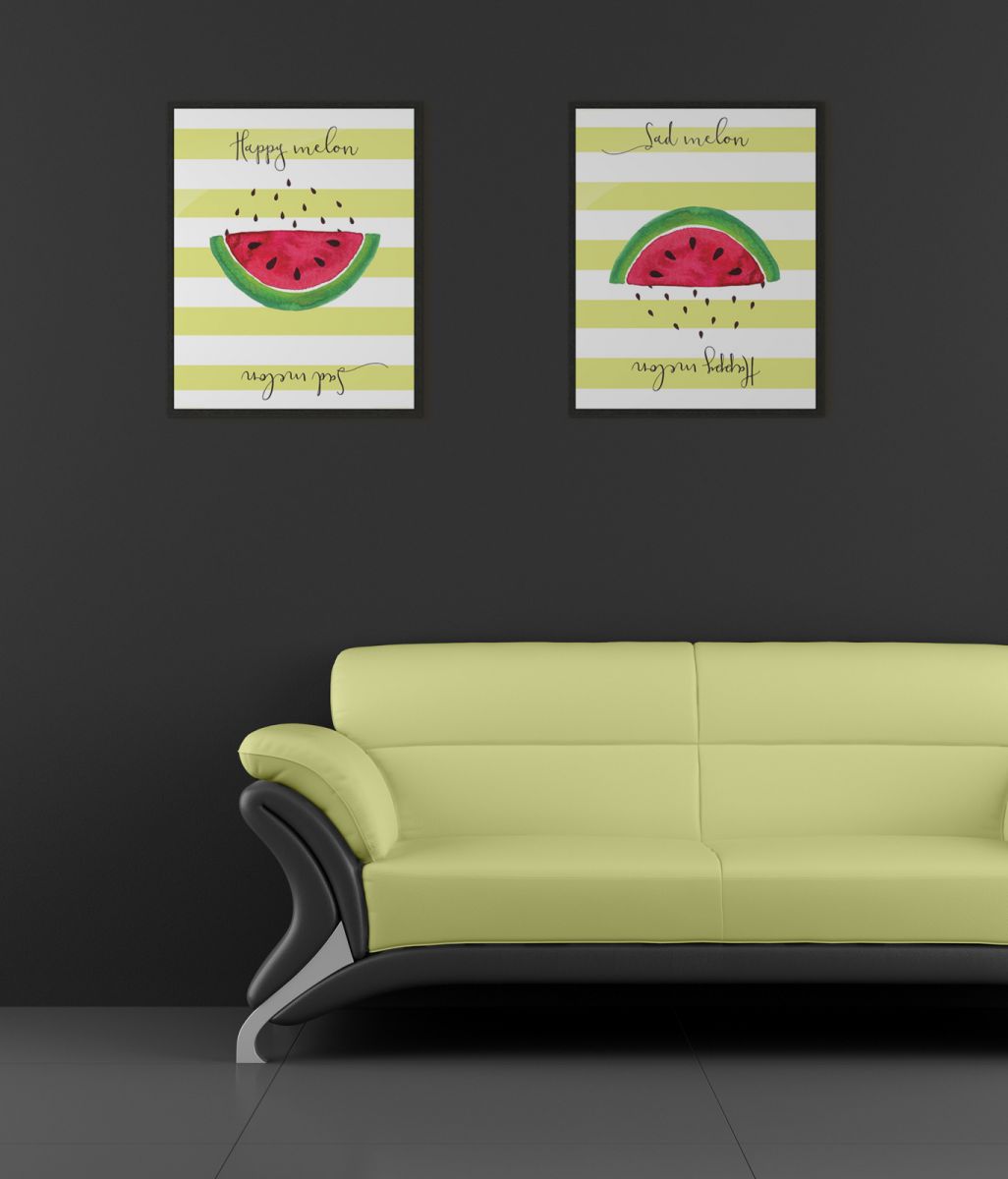 Plakat na ścianę, zatytułowany Happy melon sad melon Ciekawy i oryginalny plakat na ścianę. Wyprodukowany na papierze o wysokiej gramaturze w cyfrowej jakości. Plakat wykonany przez polskiego producenta. Świetnie nadaje się do oprawienia w ramy lub antyramy. Specyfikacja papier satynowy 220g/m2 druk cyfrowy wymiary plakatu 40x50 cm