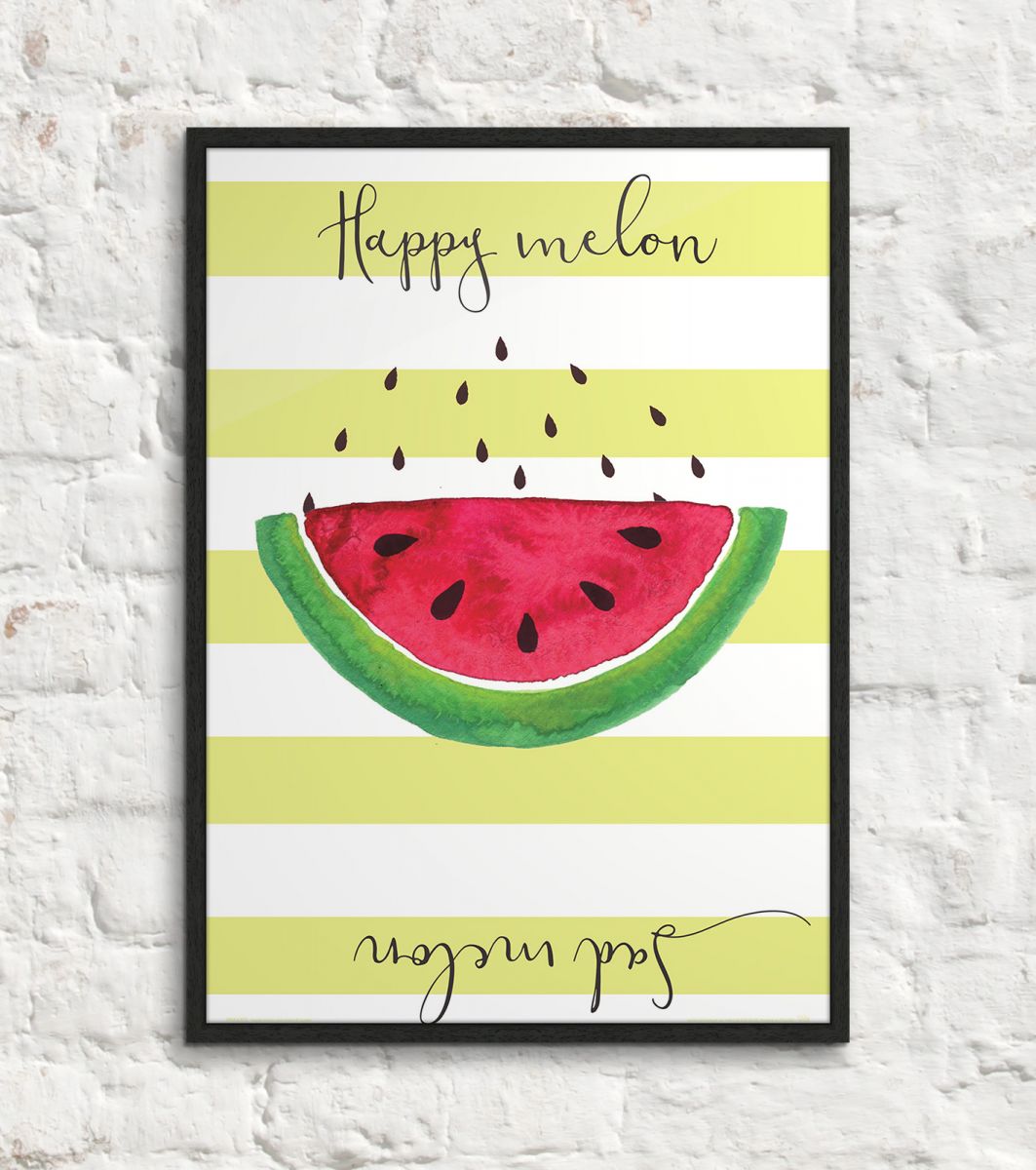 Plakat na ścianę, zatytułowany Happy melon sad melon Ciekawy i oryginalny plakat na ścianę. Wyprodukowany na papierze o wysokiej gramaturze w cyfrowej jakości. Plakat wykonany przez polskiego producenta. Świetnie nadaje się do oprawienia w ramy lub antyramy. Specyfikacja papier satynowy 220g/m2 druk cyfrowy wymiary plakatu 50x70 cm