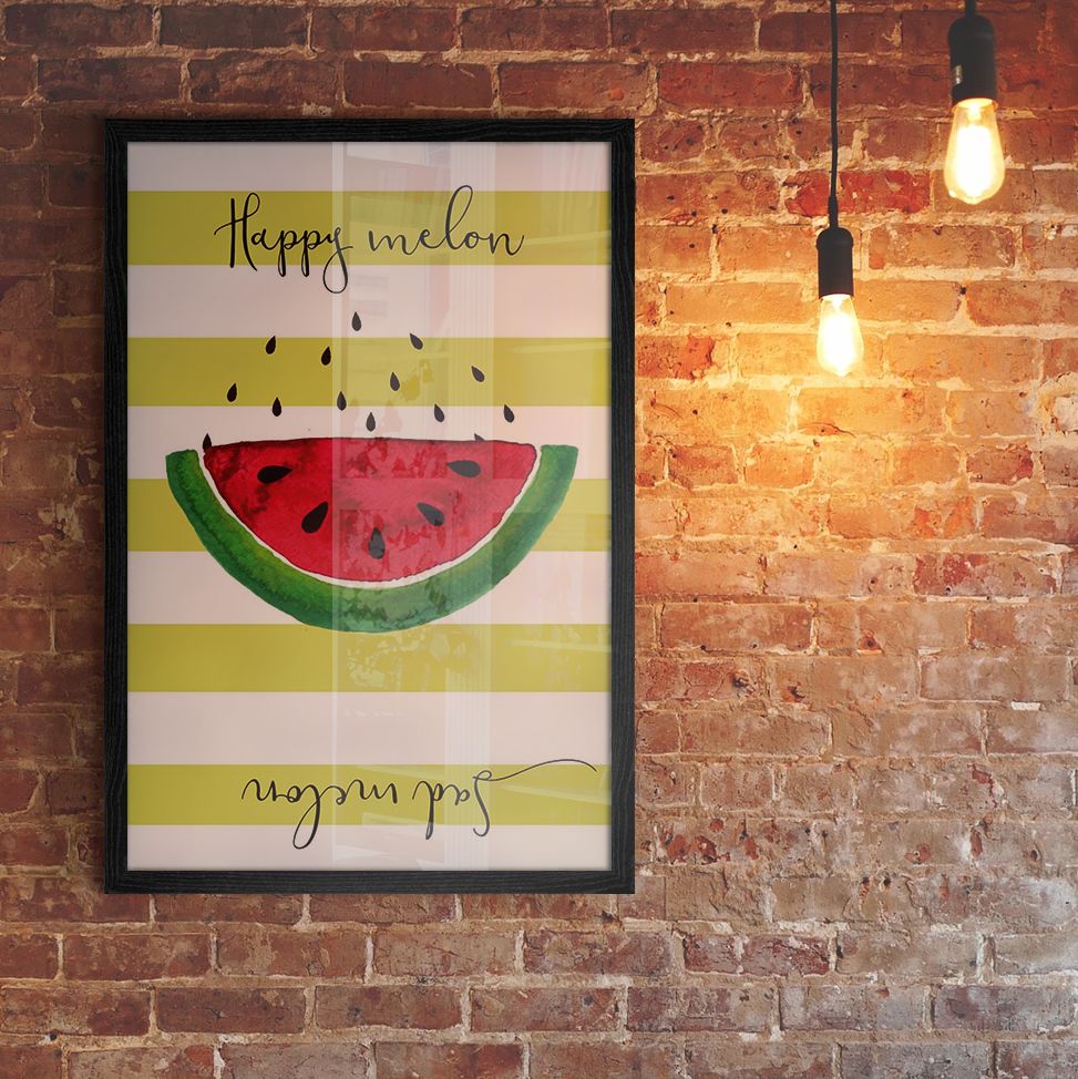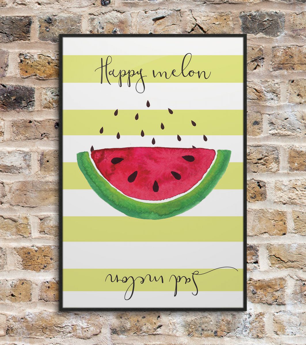 Plakat na ścianę, zatytułowany Happy melon sad melon Ciekawy i oryginalny plakat na ścianę. Wyprodukowany na papierze o wysokiej gramaturze w cyfrowej jakości. Plakat wykonany przez polskiego producenta. Świetnie nadaje się do oprawienia w ramy lub antyramy. Specyfikacja papier satynowy 220g/m2 druk cyfrowy wymiary plakatu 61x91,5 cm