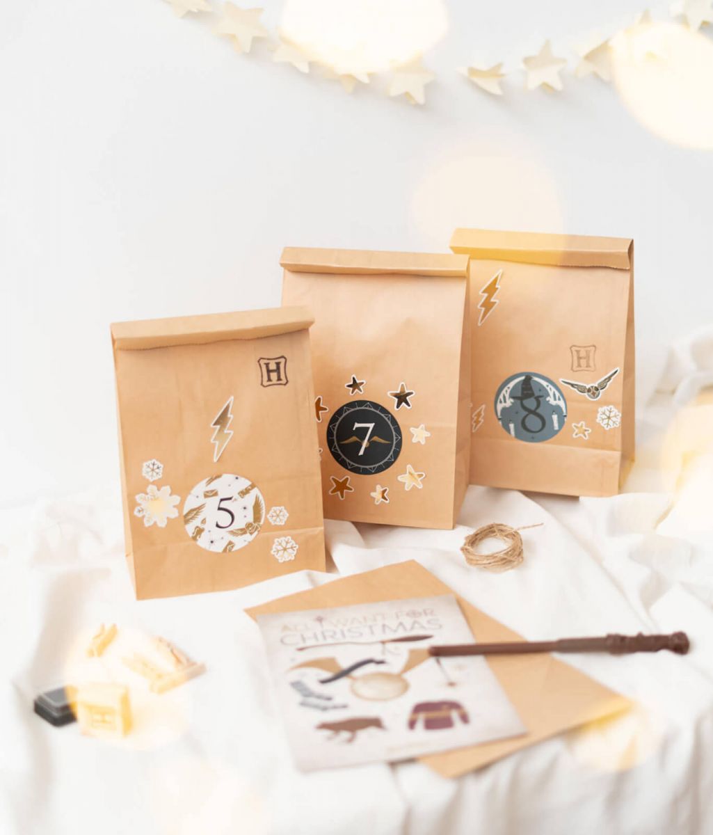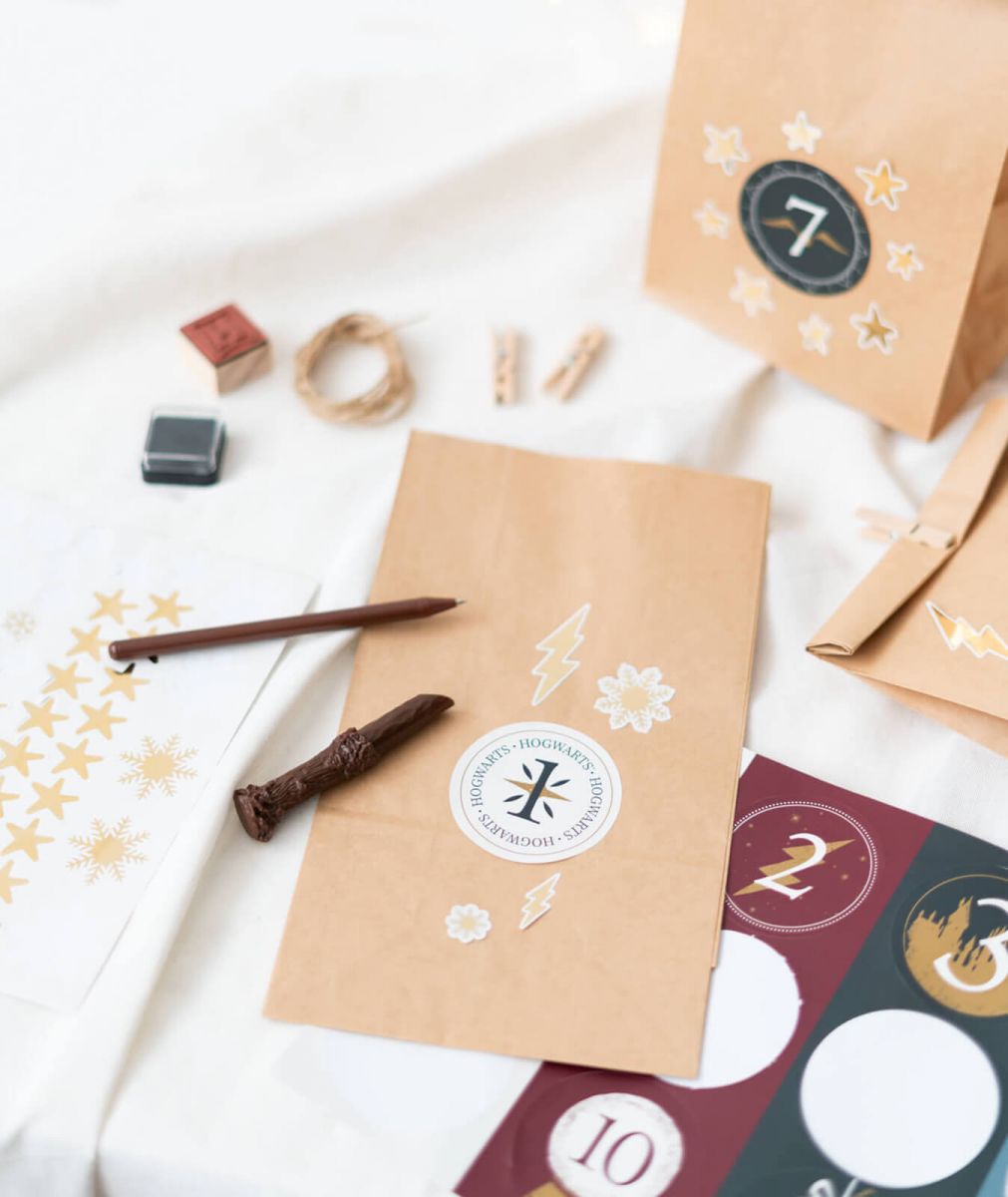 Adwentowy kalendarz DIY Harry Potter Zestaw do stworzenia personalizowanego kalendarza adwentowego dla fanów filmu HarryPotter. W środku zawiera: 25 papierowych torebeko wymiarach 27x15 cm, 24 naklejki z numerami, Kartkę świąteczną, ArkuszA4 z naklejkamiozdobnymi, 25 spinaczy z drewna, 6 metrów sznurka jutowego, Długopisróżdżka z czarnym wkładem, Stempel. Szczegóły techniczne: Komplet zapakowany jest w oryginalne kolorowe pudełko. Wymiary opakowania: 30,5x22x4,6 cm