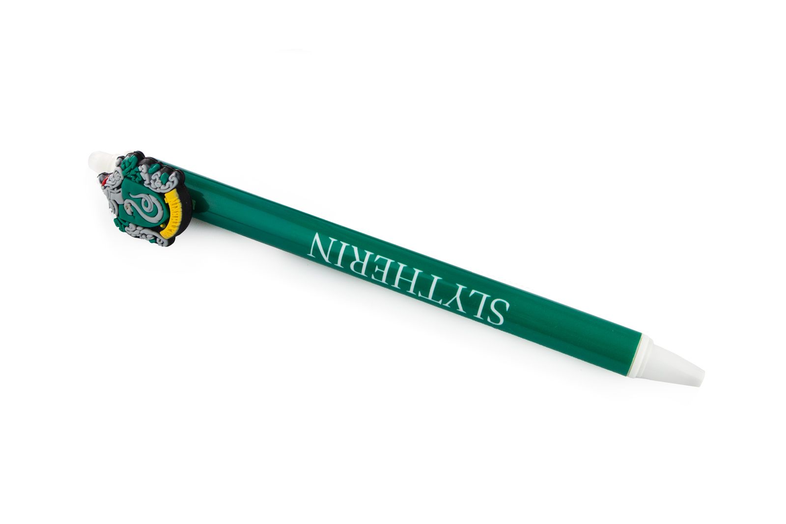 Długopis zmywalny Harry Potter Slytherin Zielony długopis z herbem Slytherinu niebieski wkład, klikany mechanizm, gumka do ścierania. Stylowy i funkcjonalny gadżet dla fanów Harry'ego Pottera. Szczegóły techniczne Kolor tuszu: niebieski Mechanizm: klik Końcówka: gumka Motyw: Slytherin Oryginalny produkt licencjonowany Harry Potter.