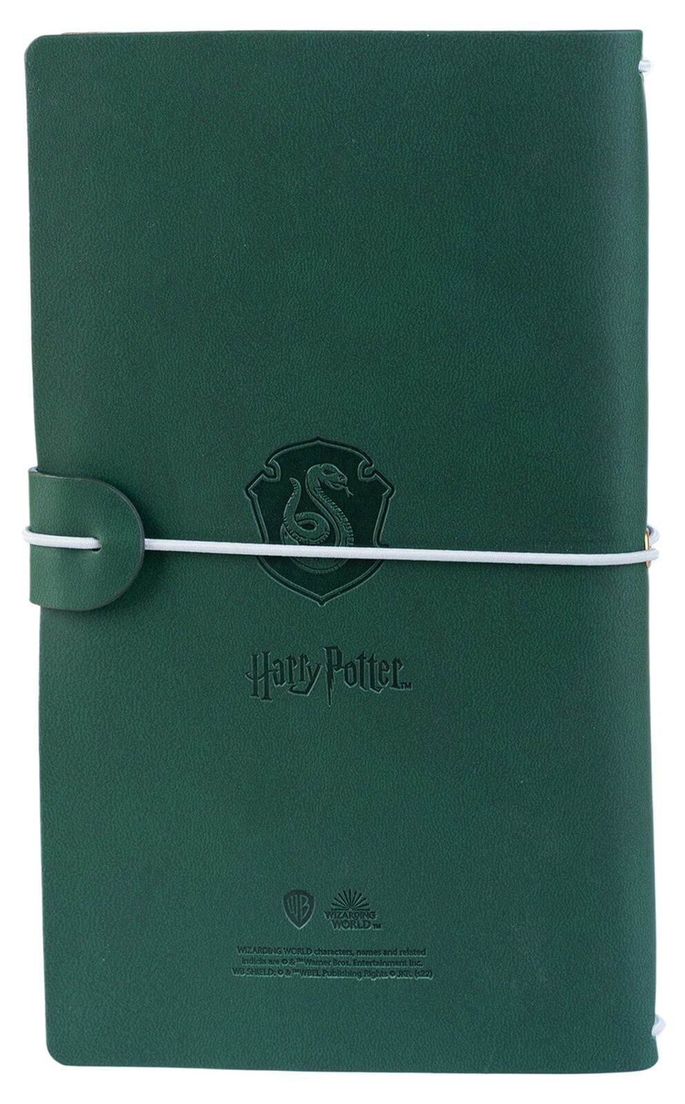 Notes skórzany Harry Potter Slytherin Świetny gadżet który wykorzystasz zarówno w szkole, jak i w pracy. Idealnie sprawdzi się też jako dziennik czy pamiętnik. Wykonany ze skóry syntetycznej. Na okładce wytłoczony jest wzór związany z głównym motywem. 144 kartki kropkowane iw szeroką linię. Zamykany na kolorową gumkę. Zawiera kieszeń ze strunowym zamkiem oraztrzy kieszenie na karty. Posiada oficjalną licencję producenta, to oryginalny gadżet! Wymiary zeszytu:12x19,5cm Marka: Grupoerik