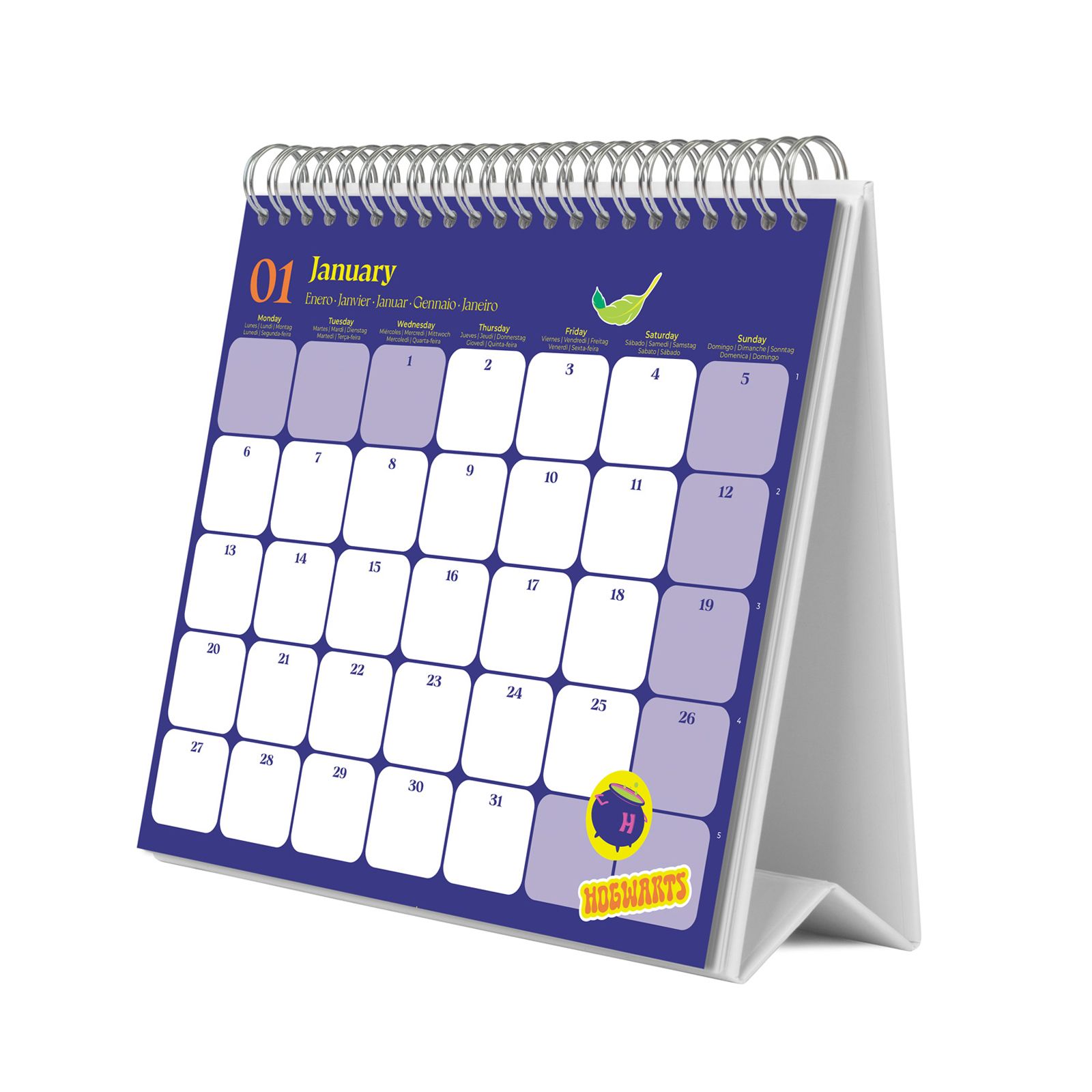 Kalendarz biurkowy 2025 Harry Potter Oryginalny kalendarz na biurko z Twoim ulubionym motywem. Na każdej ze stron o wymiarach 20x17 cm znajdziesz duże, kolorowe grafiki. Zawiera czytelne miesięczne kalendarium w dwóch wariantach. Papier jest mocny, trwały i odporny. Obraz ostry, a kolory nasycone. W kalendarzu znajduje się 12 dużych zdjęć lub ilustracji z nagłówkami w 6 językach: angielski, hiszpański, włoski, francuski, niemiecki i portugalski. Wymiary kalendarza: 20x17 cm