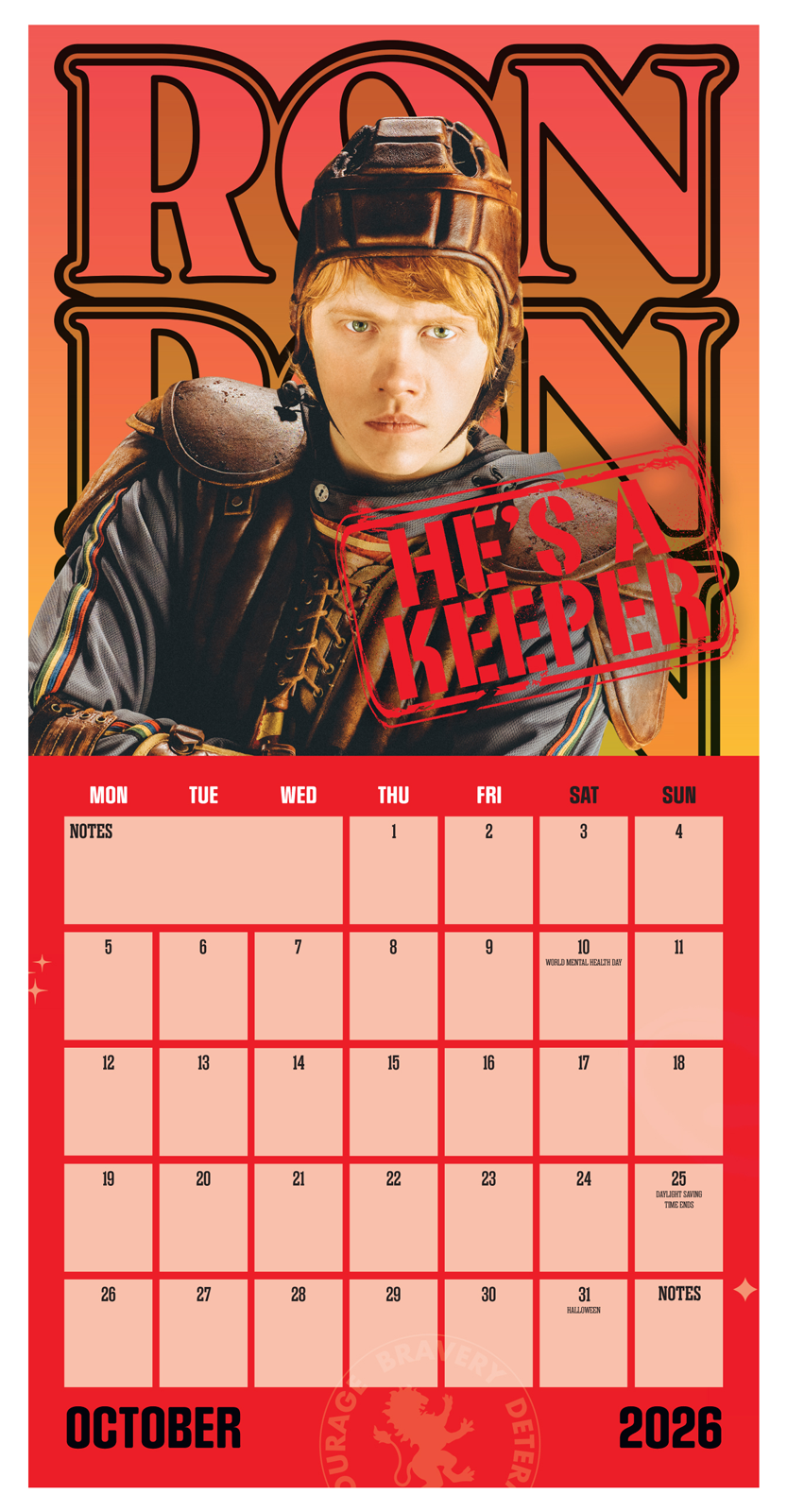 Harry Potter oficjalny kalendarz na ścianę na 2026rok Oryginalny i licencjonowany kalendarz, posiada 12 rozkładanych stron o wymiarach 30x60 cm. Na każdej z kart znajduje się duża fotografiaoraz czytelne kalendarium z miejscem na notatki. W kalendarzu znajduje się 12 unikalnych zdjęć dla każdego miesiąca. Okładki wykonane są z papieru powlekanego matowego i laminowanego o gramaturze 250 g/m?, wnętrze z papieru powlekanego matowego o gramaturze 150 g/m?. Nagłówki są w języku angielskim. Oprawa zszywkowa. Złożony kalendarz 30x30 cm. Rozłożony kalendarz 30x60 cm. Zawiera otwór 5 mm do zawieszenia na ścianie.