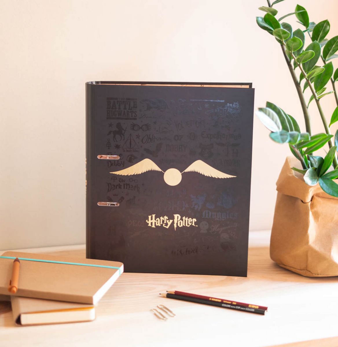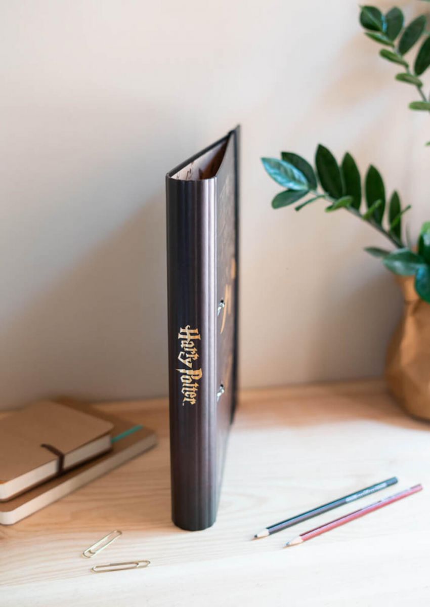 Segregator Harry Potter Segregator biurowy na dokumenty, rysunki, wycinki, kolekcje. Twarda tekturowa okładka o grubości 2 mm. Wnętrze wyłożone laminowanym papierem o gramaturze 150 g. Zamykany na kolorową gumkę. Oryginalny produkt posiadający licencję producenta. Szczegóły techniczne Wymiary segregatora: 29,7 x 21 cm