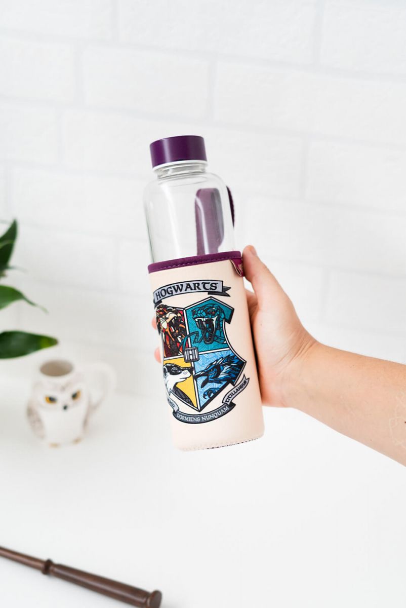 Butelka ze szkła Harry Potter Wybierając szklanąeco butelkę wielokrotnego użytku dbasz o nasze środowisko. Butelka na napoje z oryginalnymmotywem jest świetnym gadżetem dla każdego fana. Wykonana ze szkłaborokrzemianowego. Pojemność 500 ml. Marka: Grupoerik
