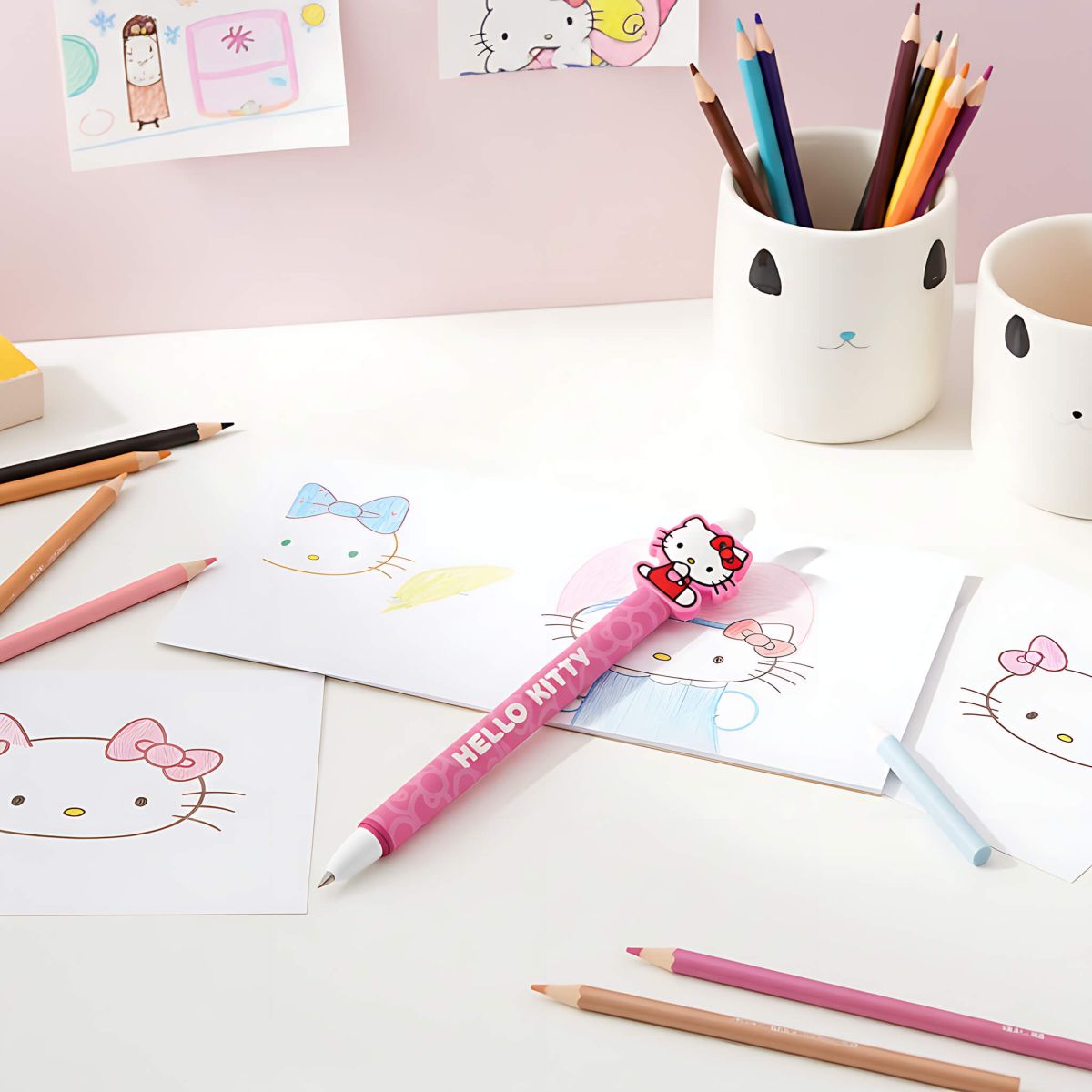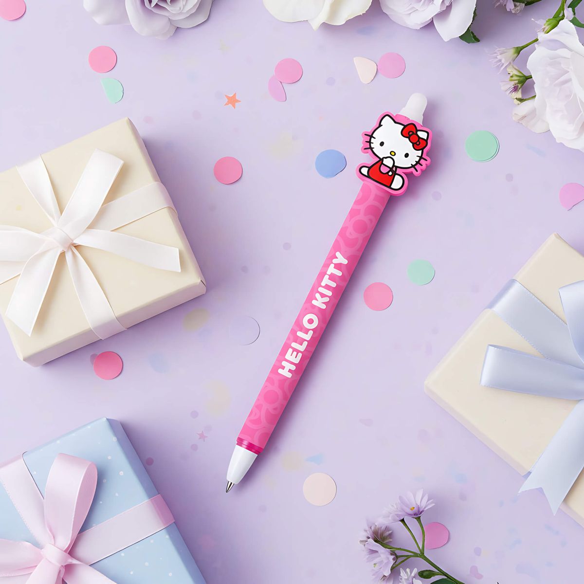 Hello Kitty Pink - długopis zmazywalny Numer katalogowy: SR2404716A Producent: Pyramid International Wymiary: 15,5 x 3,5 cm Zmywalny długopis żelowy w pastelowej odsłonie z topperem Hello Kitty. Klikany mechanizm i niebieski tusz połączono z gumką do ścierania, aby szybko korygować notatki. Lekki korpus i gładkie pisanie czynią z niego praktyczny dodatek do szkolnego i biurowego piórnika. Szczegóły techniczne: Rodzaj: zmywalny długopis żelowy Kolor tuszu: niebieski Mechanizm: klik Końcówka: gumka Motyw: Hello Kitty Oryginalny produkt na oficjalnej licencji Hello Kitty.