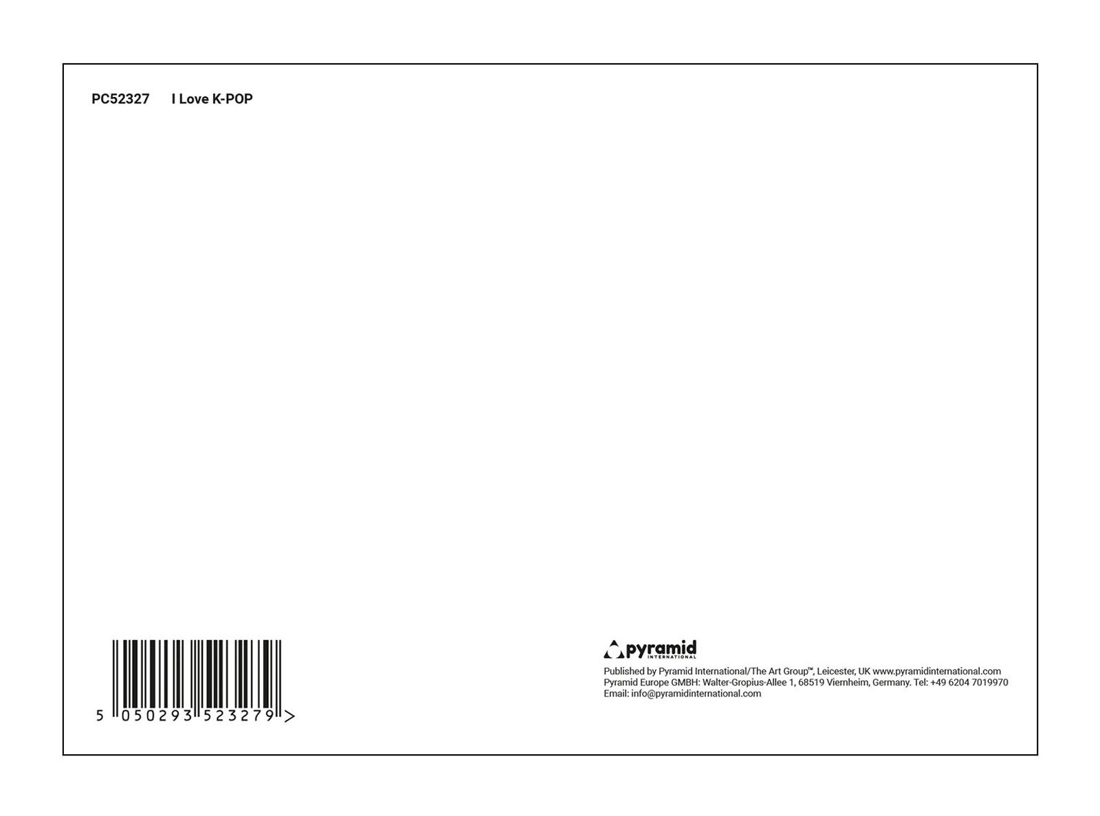 Pocztówka I Love K-Pop Numer katalogowy: PC52327 Producent: Pyramid International Wymiary: 14,8 x 10,5 cm Minimalistyczna pocztówka z czytelnym hasłem I Love K-Pop i motywem finger heart to estetyczny dodatek dla fanów koreańskiej popkultury. Prosta kompozycja i mocny kontrast sprawiają, że grafika jest bardzo wyrazista. Taki format dobrze sprawdza się jako drobny upominek lub kartka do krótkiej wiadomości. Motyw jest lekki, nowoczesny i łatwo dopasowuje się do różnych stylów. Szczegóły techniczne Motyw: I Love K-Pop Grafika: gest finger heart z sercem Kolorystyka: biel, czerń, pastelowy róż Oryginalny produkt z licencją K-Pop Demon Hunters.