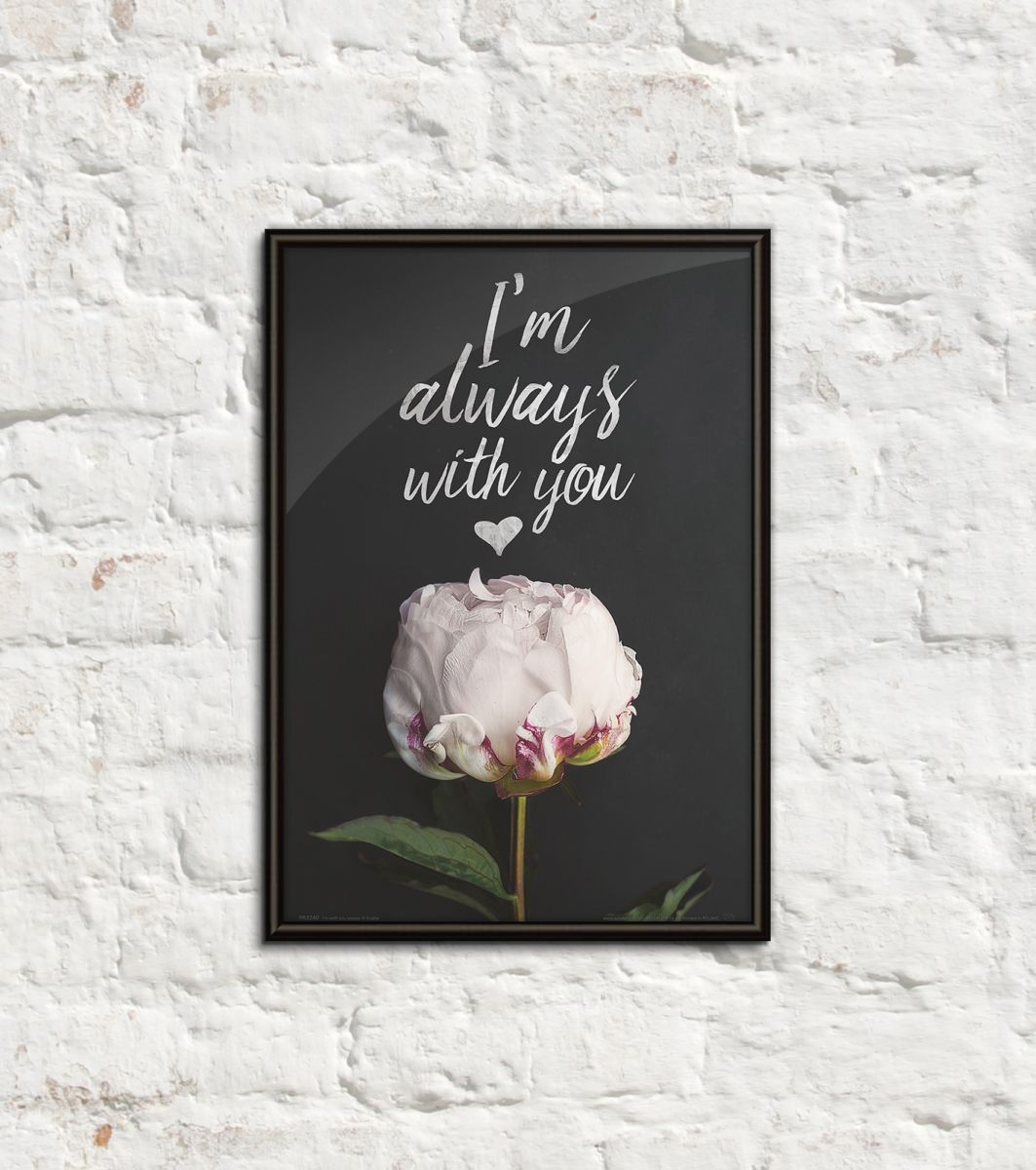 Plakat na ścianę, zatytułowany I'm with you always Ciekawy i oryginalny plakat na ścianę. Wyprodukowany na papierze o wysokiej gramaturze w cyfrowej jakości. Plakat wykonany przez polskiego producenta. Świetnie nadaje się do oprawienia w ramy lub antyramy. Specyfikacja papier satynowy 220g/m2 druk cyfrowy wymiary plakatu 29,7x42 cm