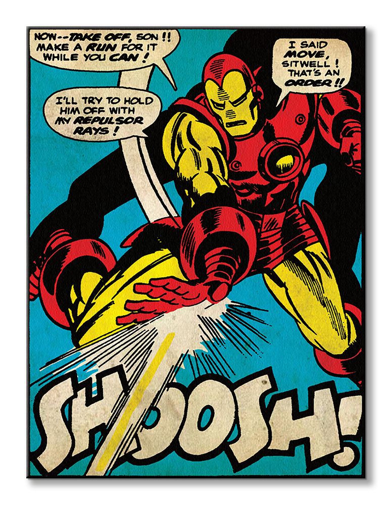 Obraz na ścianę noszący nazwę Iron Man (Shoosh). Szukasz oryginalnej, ekskluzywnej dekoracji na ścianę? Ten obraz jest dla Ciebie! nasycone kolory i doskonała jakość., obrazy charakteryzuje wysokie nasycenie barw i ostrość, nie sposób oderwać od nich wzrok. Kolory utrzymują się przez długie lata. Bawełniane płótno wysokiej jakości gwarantuje świetne odwzorowanie i trwałość obrazu.