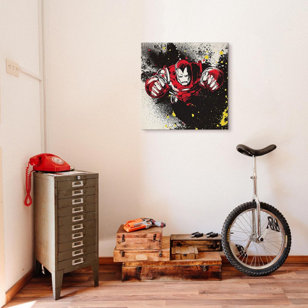 Obraz na ścianę noszący nazwę Iron Man (Splatter). Szukasz oryginalnej, ekskluzywnej dekoracji na ścianę? Ten obraz jest dla Ciebie! wyraziste barwy i doskonała ostrość nadruku., obrazy charakteryzuje wysokie nasycenie barw i ostrość, nie sposób oderwać od nich wzrok. Kolory utrzymują się przez długie lata. Doskonałej jakości płótno to gwarancja naturalnego wyglądu i trwałości obrazu.