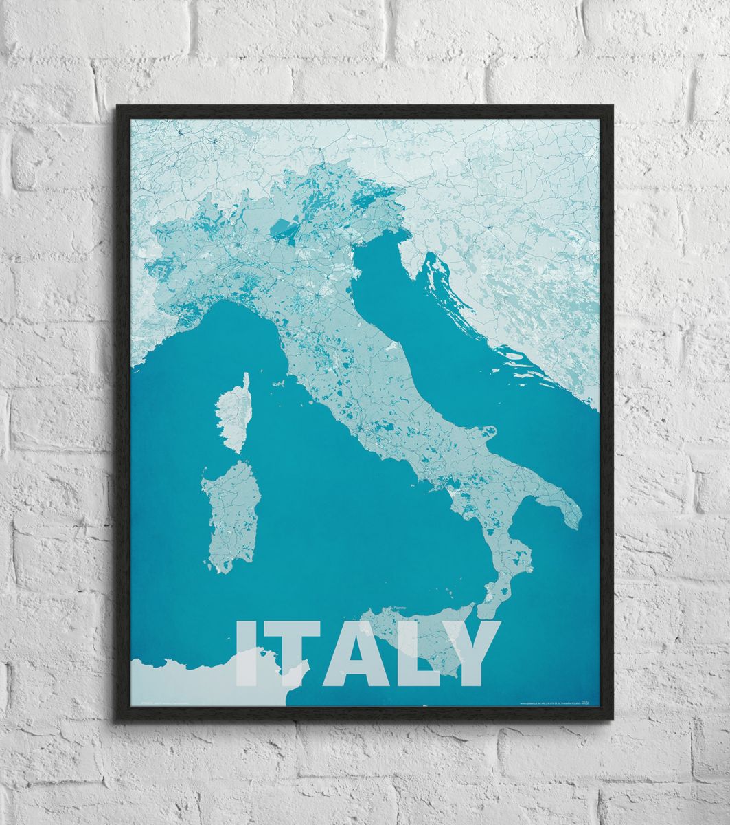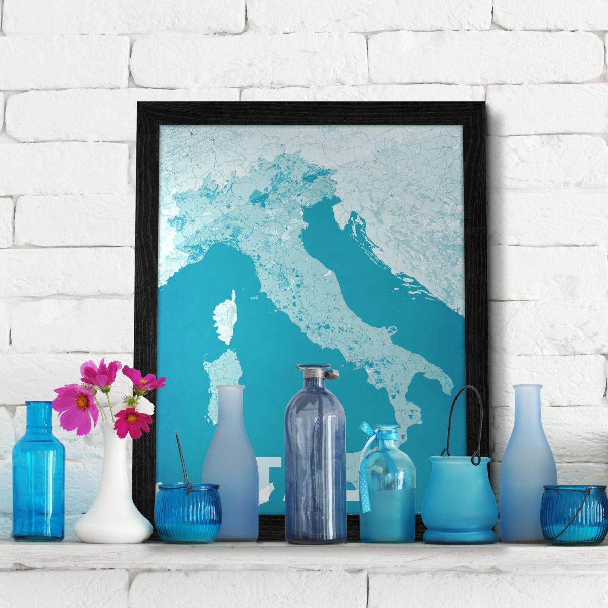 Plakat z mapą na ścianę, zatytułowany Italy, modern blue Ciekawa i oryginalna mapa na ścianę. Wyprodukowany na papierze o wysokiej gramaturze w cyfrowej jakości. Mapy wykonane przez polskiego producenta. Świetnie nadają się do oprawienia w ramy lub antyramy. Specyfikacja papier satynowy 220g/m2 druk cyfrowy wymiary map 40x50 cm