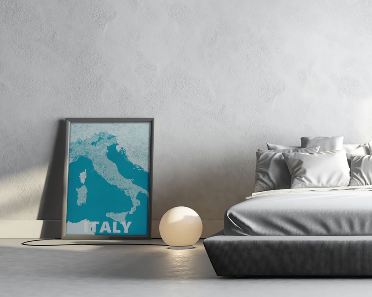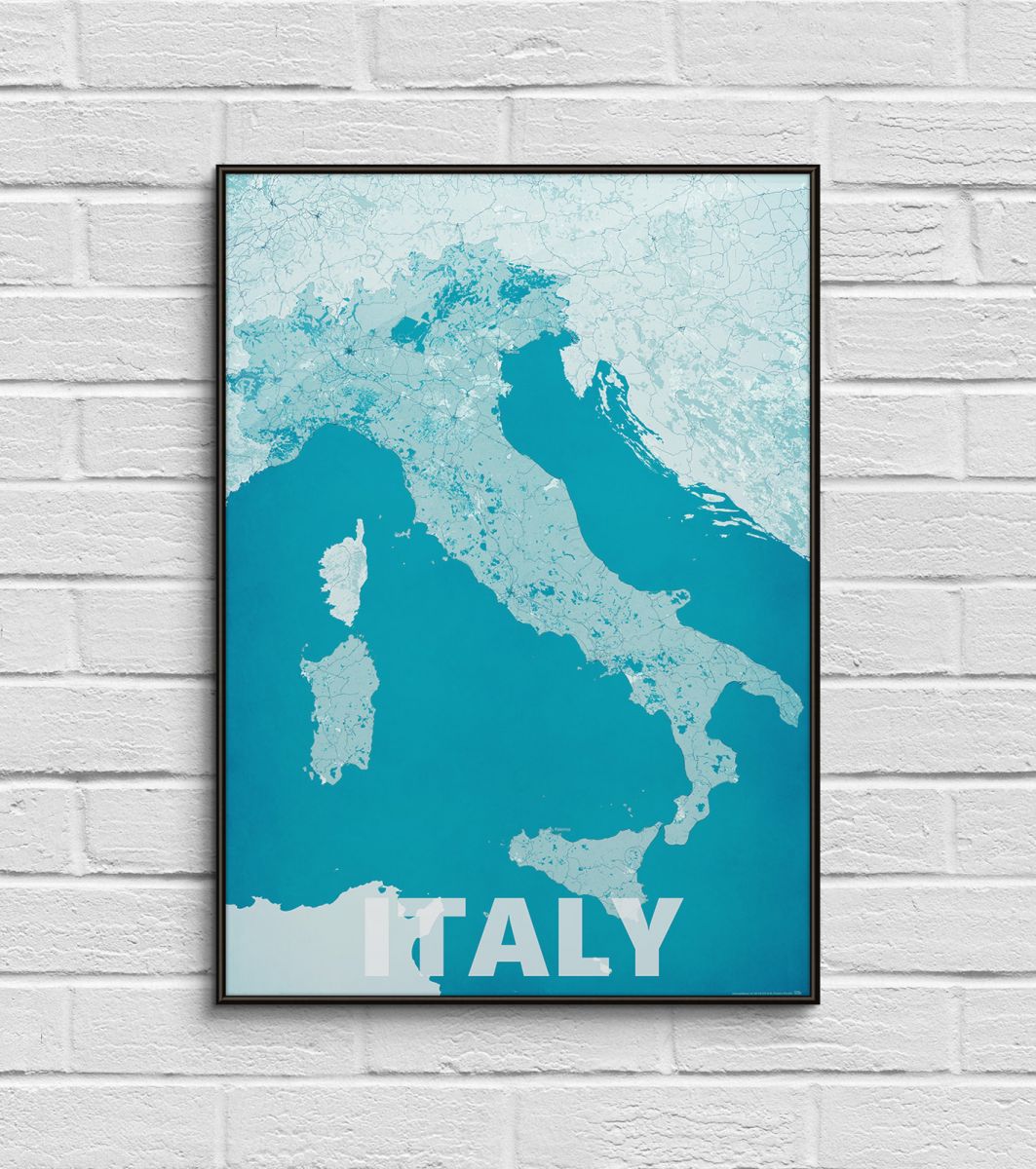 Plakat z mapą na ścianę, zatytułowany Italy, modern blue Ciekawa i oryginalna mapa na ścianę. Wyprodukowany na papierze o wysokiej gramaturze w cyfrowej jakości. Mapy wykonane przez polskiego producenta. Świetnie nadają się do oprawienia w ramy lub antyramy. Specyfikacja papier satynowy 220g/m2 druk cyfrowy wymiary map 50x70 cm