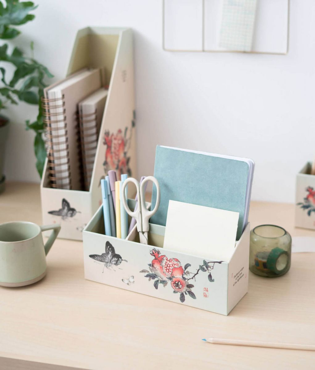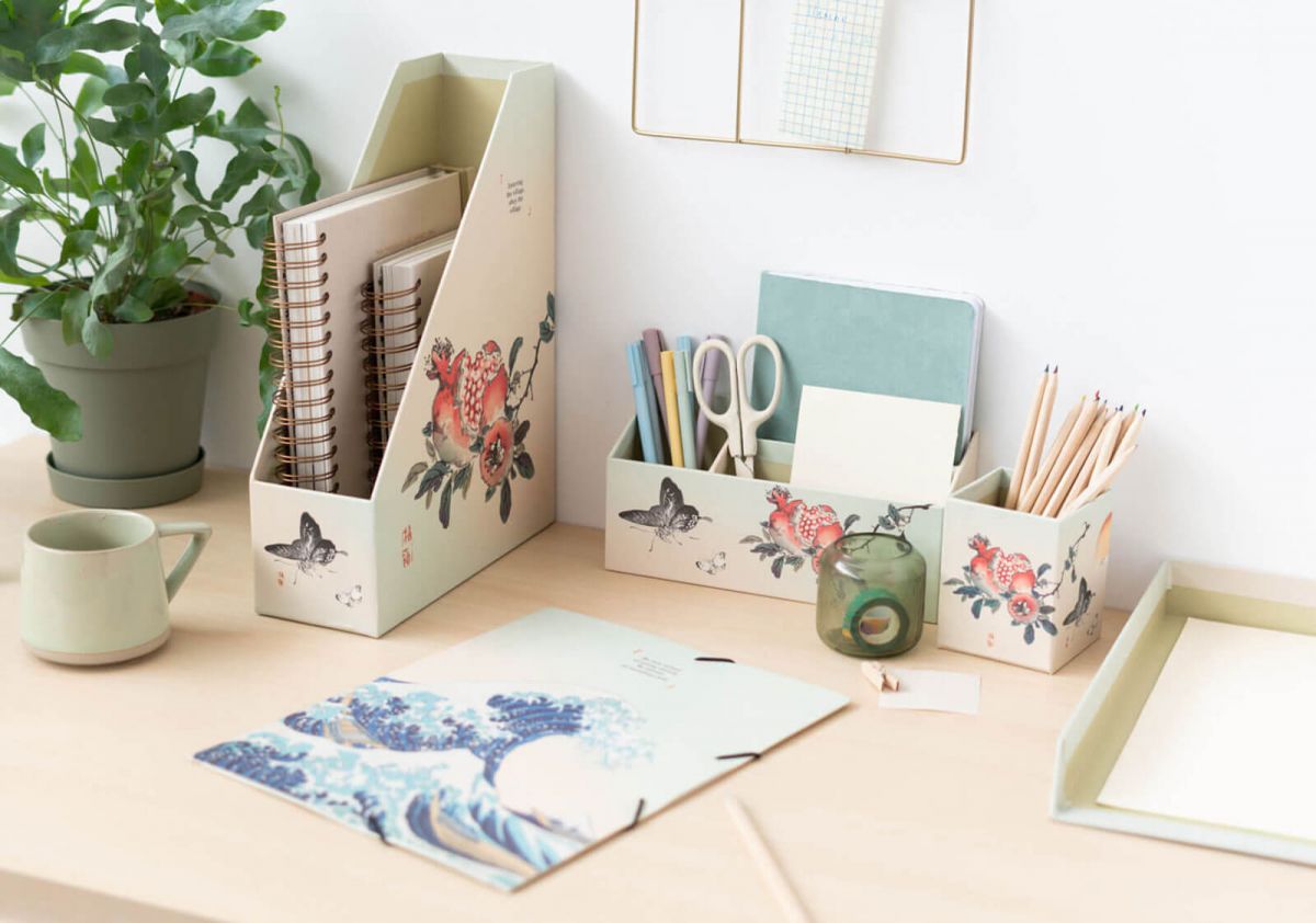 Zestaw organizerów Japanese Art Pięcioczęściowy zestaw przyborników na biurko. Wykonany z trwałej tektury z wyrazistym grafikiem. To licencjonowany i oryginalny gadżet. W skład zestawu wchodzą: 2 pojemniki na długopisy, kredki, pisaki itp. duży pojemnik pionowy na dokumenty. taca na dokumenty. podkładka z zabezpieczającymi gumkami. Wymiary opakowania: 25x33,5x9 cm Producent: Grupoerik