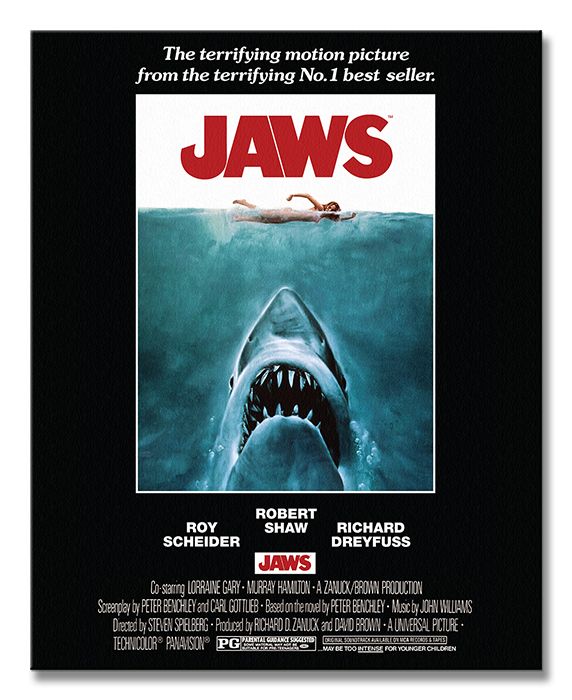 Obraz na ścianę noszący nazwę JAWS (ONE SHEET). Szukasz oryginalnej, ekskluzywnej dekoracji na ścianę? Ten obraz jest dla Ciebie! doskonała jakość barw i jakość wykonania., obrazy charakteryzuje wysokie nasycenie barw i ostrość, nie sposób oderwać od nich wzrok. Kolory utrzymują się przez długie lata. Mocne bawełniane płótno wygląda naturalnie i oddaje charakter autentyczności obrazu.