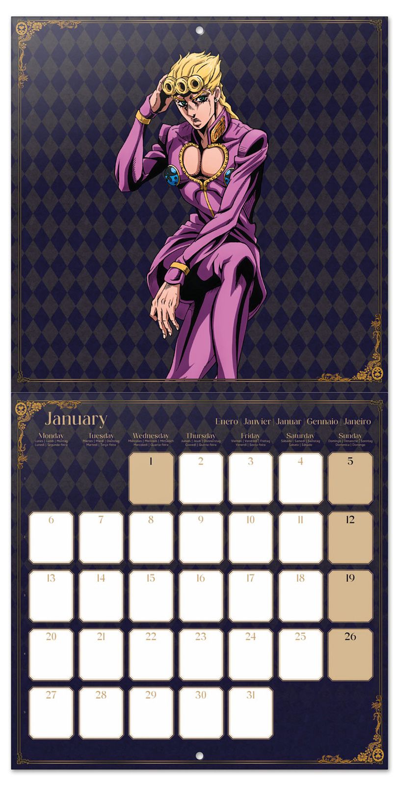 Jojos Bizarre Adventure oficjalny kalendarz na ścianę na 2025rok Oryginalny i licencjonowany kalendarz, posiada 12 rozkładanych stron o wymiarach 30x60 cm. Na każdej z kart znajduje się duża fotografiaoraz czytelne kalendarium z miejscem na notatki. W kalendarzu znajduje się 12 unikalnych zdjęć dla każdego miesiąca. Okładki wykonane są z papieru powlekanego matowego i laminowanego o gramaturze 250 g/m?, wnętrze z papieru powlekanego matowego o gramaturze 150 g/m?. Nagłówki są w 6 językach: angielski, hiszpański, francuski, niemiecki, włoski i portugalski Oprawa zszywkowa. Złożony kalendarz 30x30 cm. Rozłożony kalendarz 30x60 cm. Zawiera otwór 5 mm do zawieszenia na ścianie.