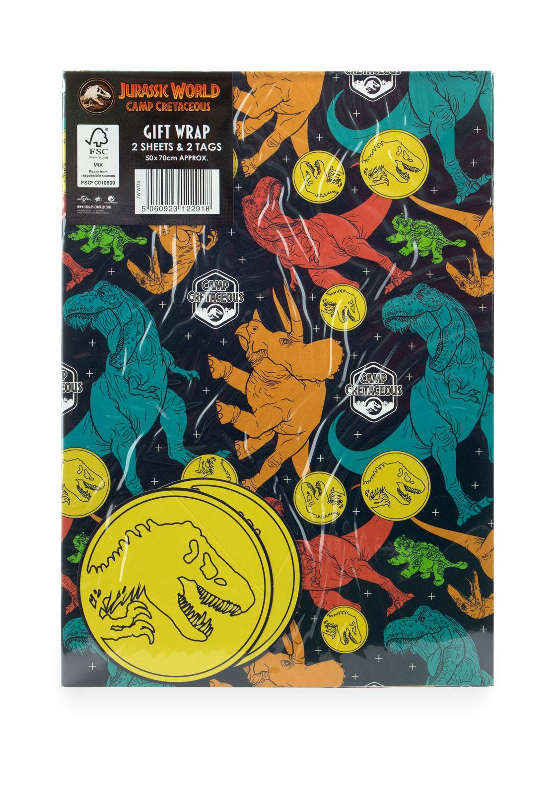 Papier do pakowania Jurassic World Wzbogać ofertę swojego sklepu o papier do pakowania Jurassic World, który doda magii i przygody każdemu prezentowi. Zestaw zawiera dwa arkusze papieru oraz dwie ozdobne kartki na życzenia, co sprawia, że każdy upominek nabiera osobistego i efektownego wyglądu. Papier z realistycznymi motywami dinozaurów przyciąga wzrok i sprawia, że prezent wyróżnia się na tle innych. Szczegóły techniczne: Wymiary arkuszy: 50 x 70 cm Materiał: papier ozdobny Motyw: Jurassic World Zestaw: 2 arkusze + 2 kartki na życzenia Licencjonowany produkt W pełni licencjonowany produkt, idealny do sprzedaży detalicznej.