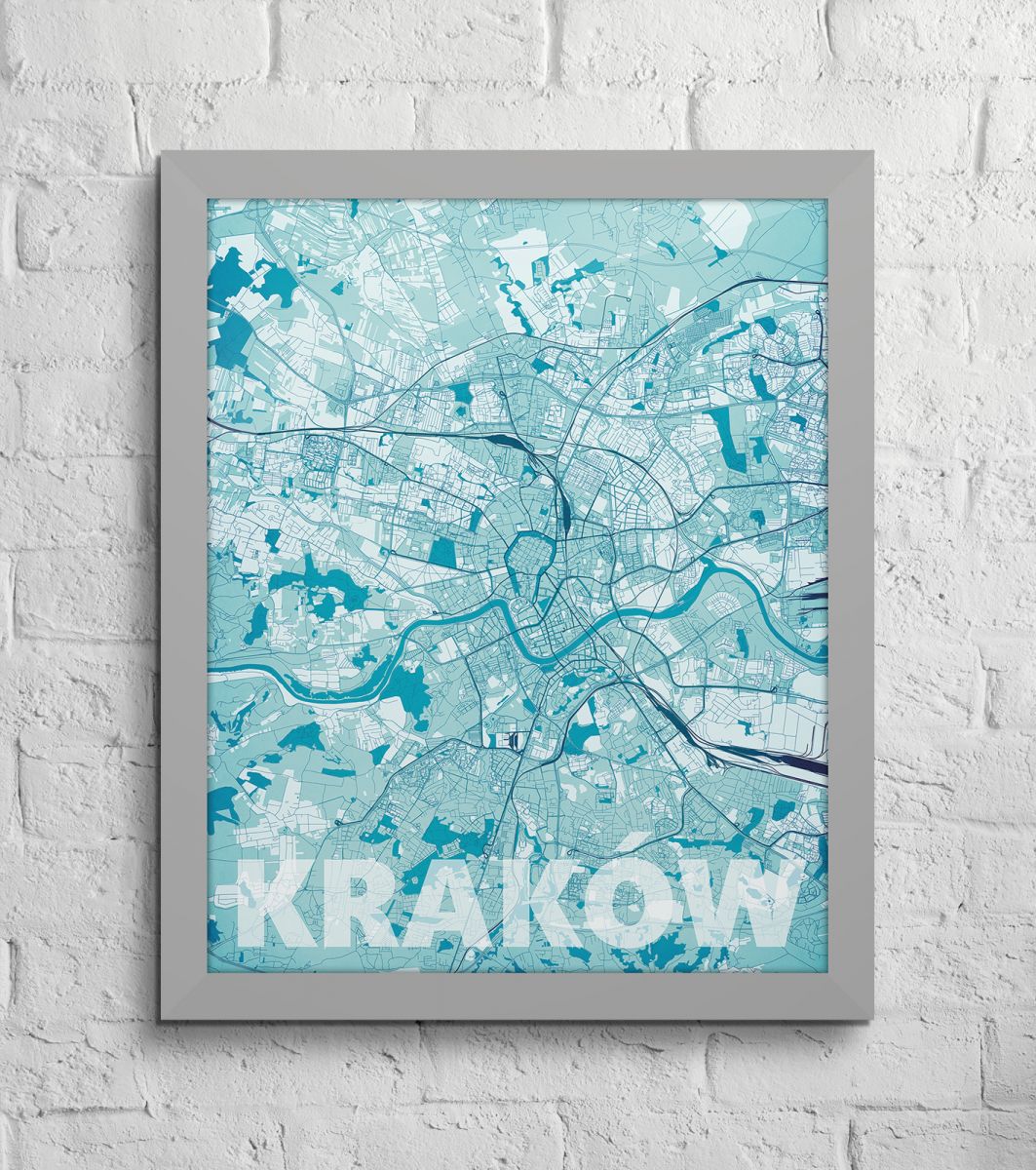 Artystyczna mapa na ścianę, zatytułowana Kraków - Błękitna mapa Ciekawy i oryginalny plakat na ścianę. Wyprodukowany na papierze o wysokiej gramaturze w cyfrowej jakości. Plakat wykonany przez polskiego producenta. Świetnie nadaje się do oprawienia w ramy lub antyramy. Specyfikacja papier satynowy 220g/m2 druk cyfrowy wymiary plakatu 40x50 cm