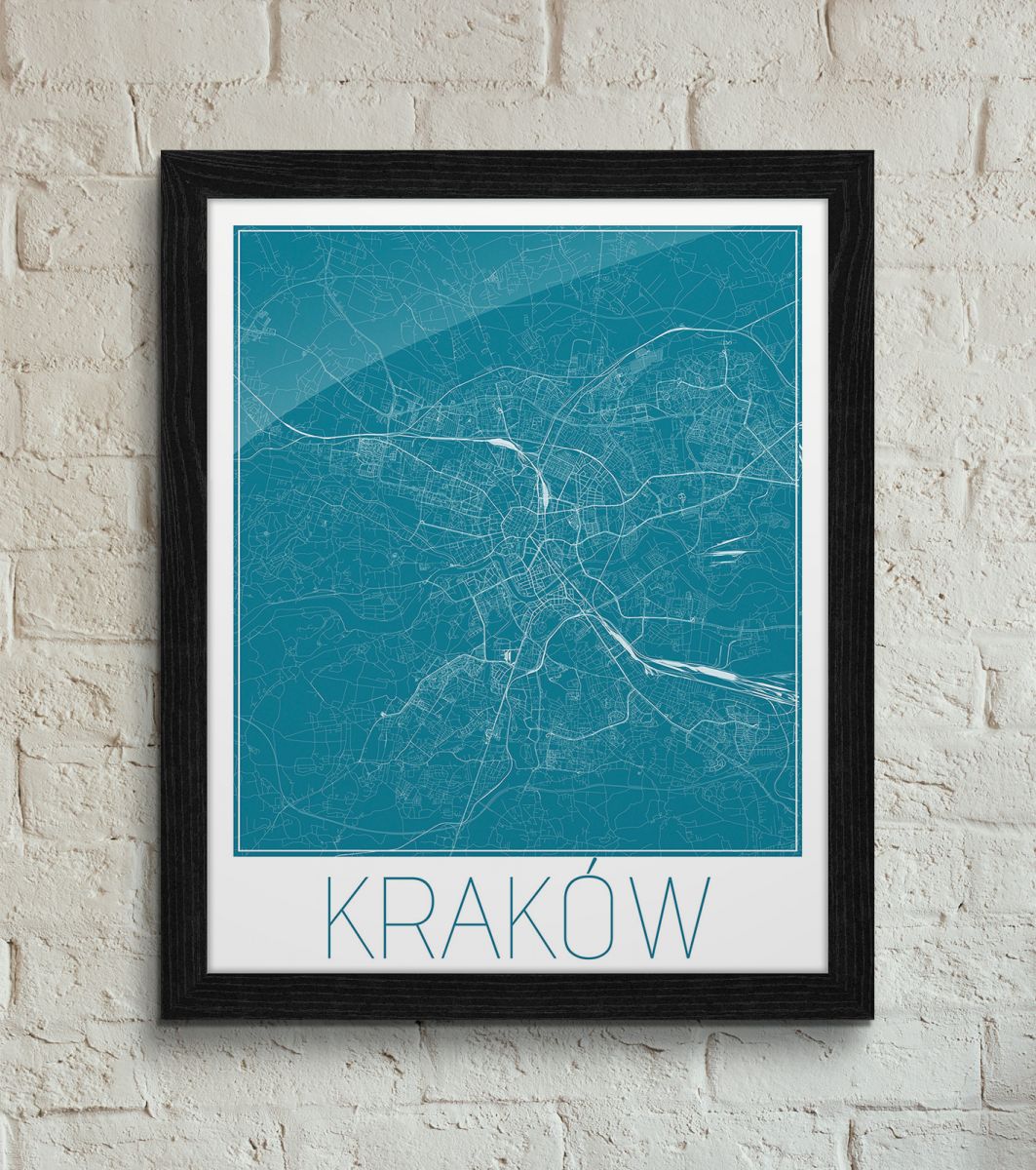 Artystyczna mapa na ścianę, zatytułowana Kraków - Niebieska mapa Ciekawy i oryginalny plakat na ścianę. Wyprodukowany na papierze o wysokiej gramaturze w cyfrowej jakości. Plakat wykonany przez polskiego producenta. Świetnie nadaje się do oprawienia w ramy lub antyramy. Specyfikacja papier satynowy 220g/m2 druk cyfrowy wymiary plakatu 40x50 cm