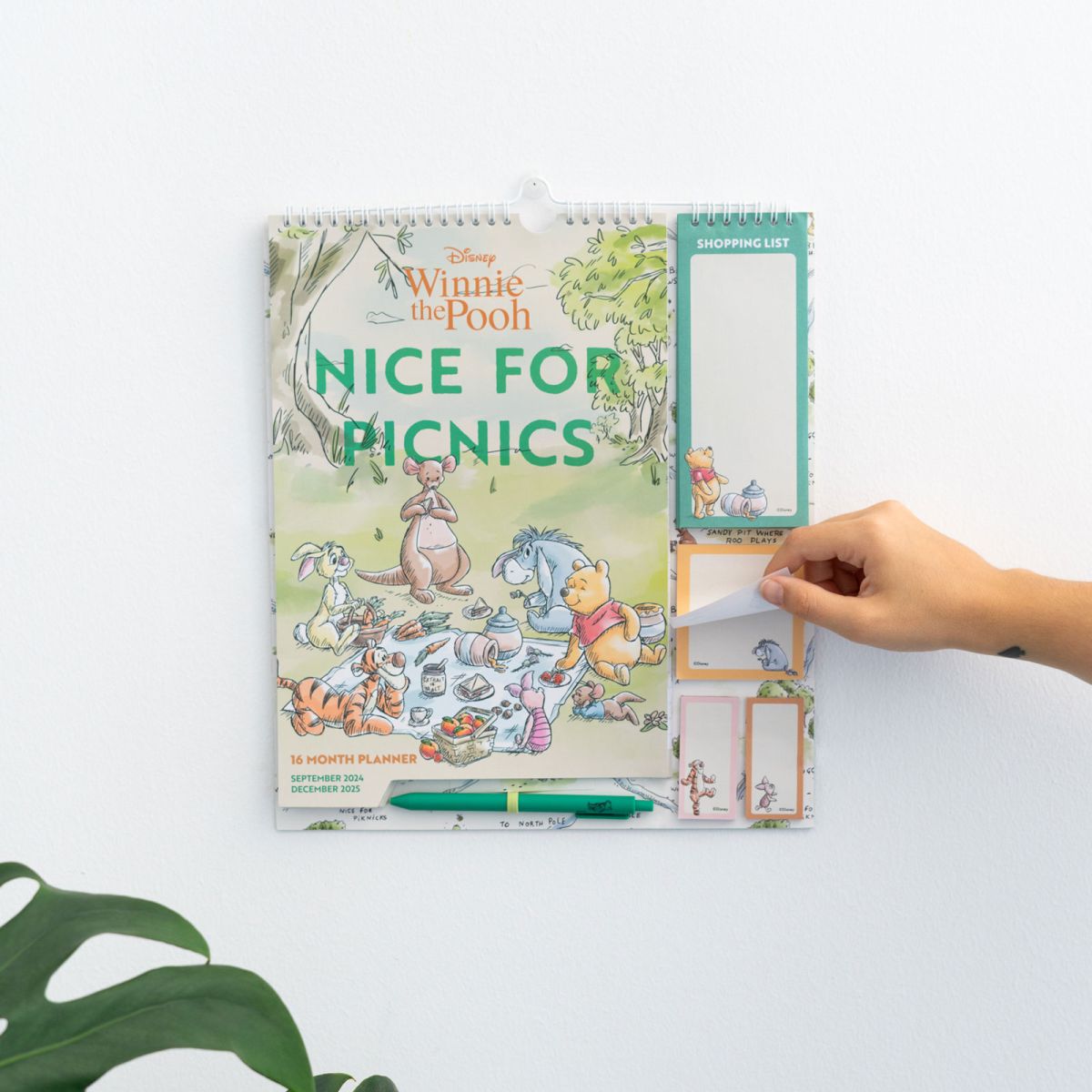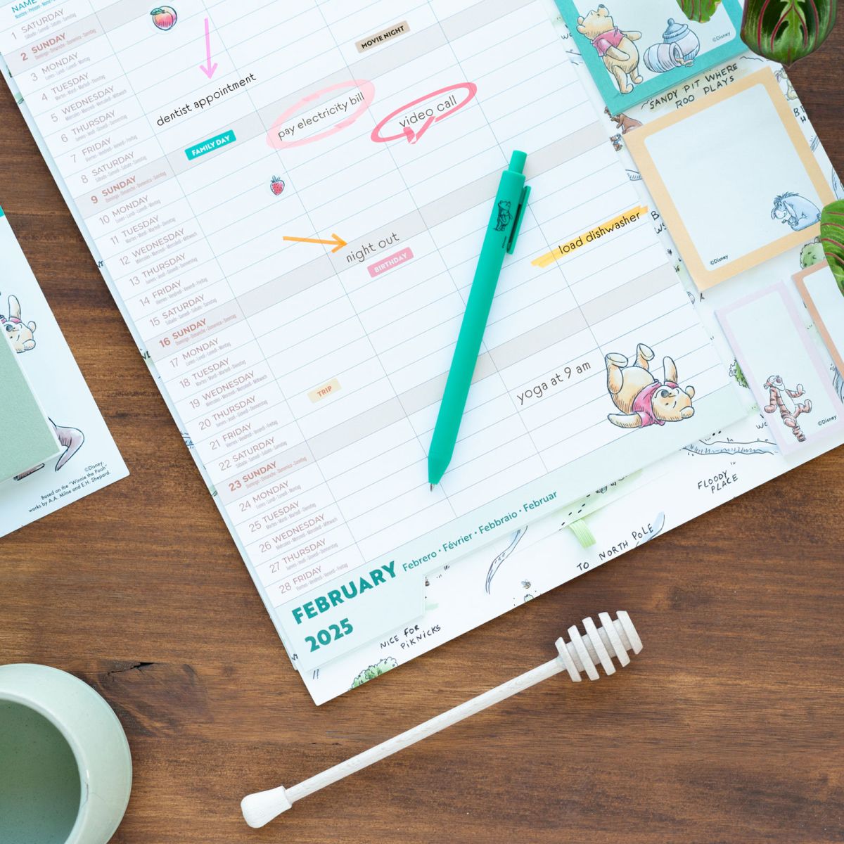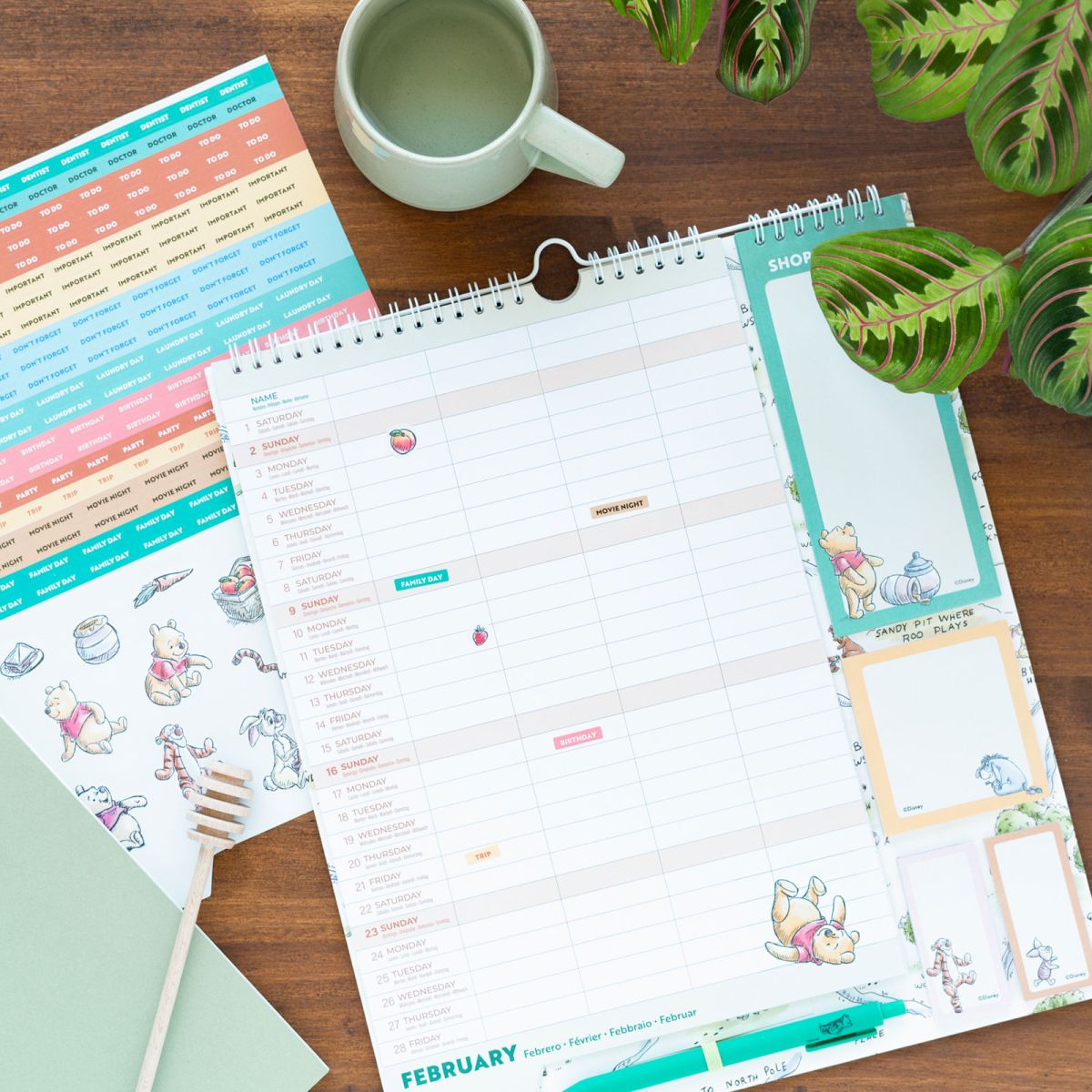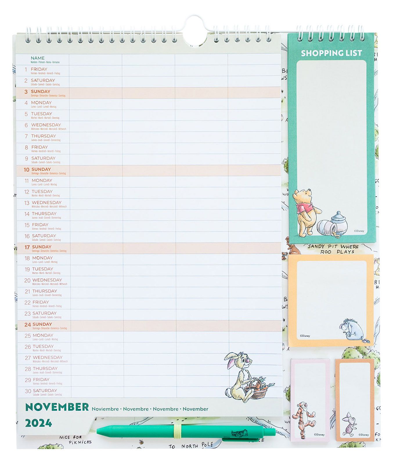 Planer na ścianę Kubuś Puchatek na 2024/2025 Ścienny kalendarz planer na cały rok. Kalendarz planowania ma wymiary 29,5x34 cm, zawiera 16 miesięcy (od września 2024 r. do grudnia 2025r.) Miejsce na zapiski podzielone jest na kolumny. Oprócz kalendarza planowania dostępnych jest kilka akcesoriów takich jak: kartki na listę zakupów kartkisamoprzylepne, arkusze naklejek do kalendarza, długopis. Języki nagłówków: angielski, hiszpański, francuski, włoski i niemiecki. Szczegóły techniczne: Wymiary kalendarza:29,5x34cm