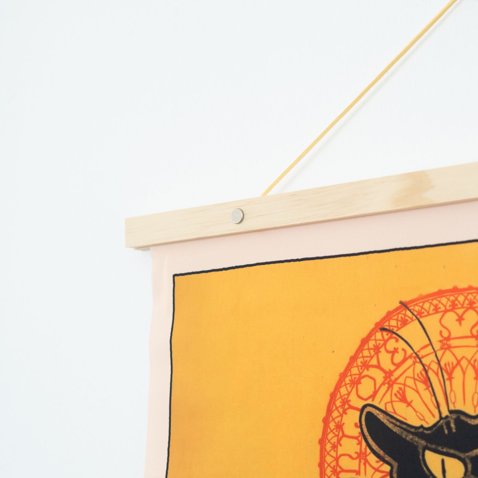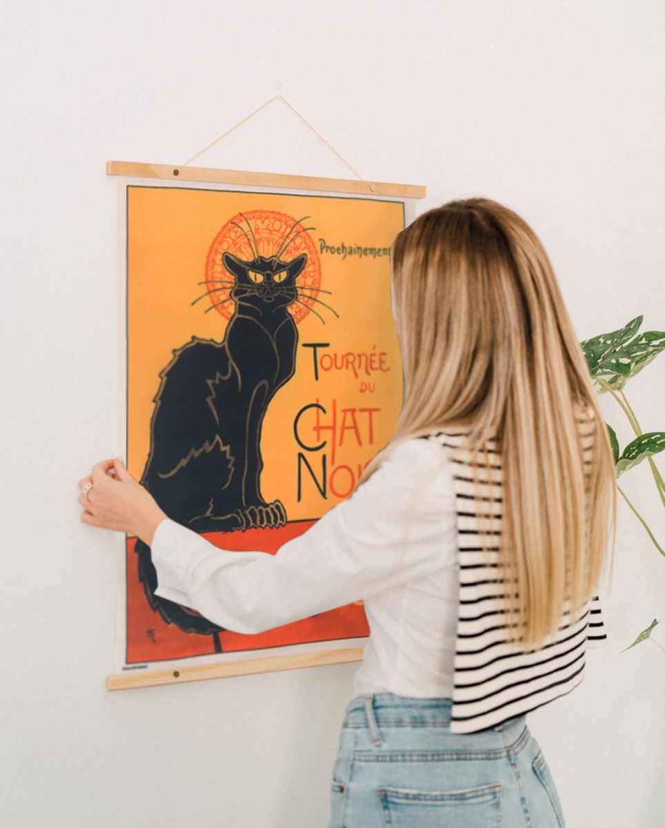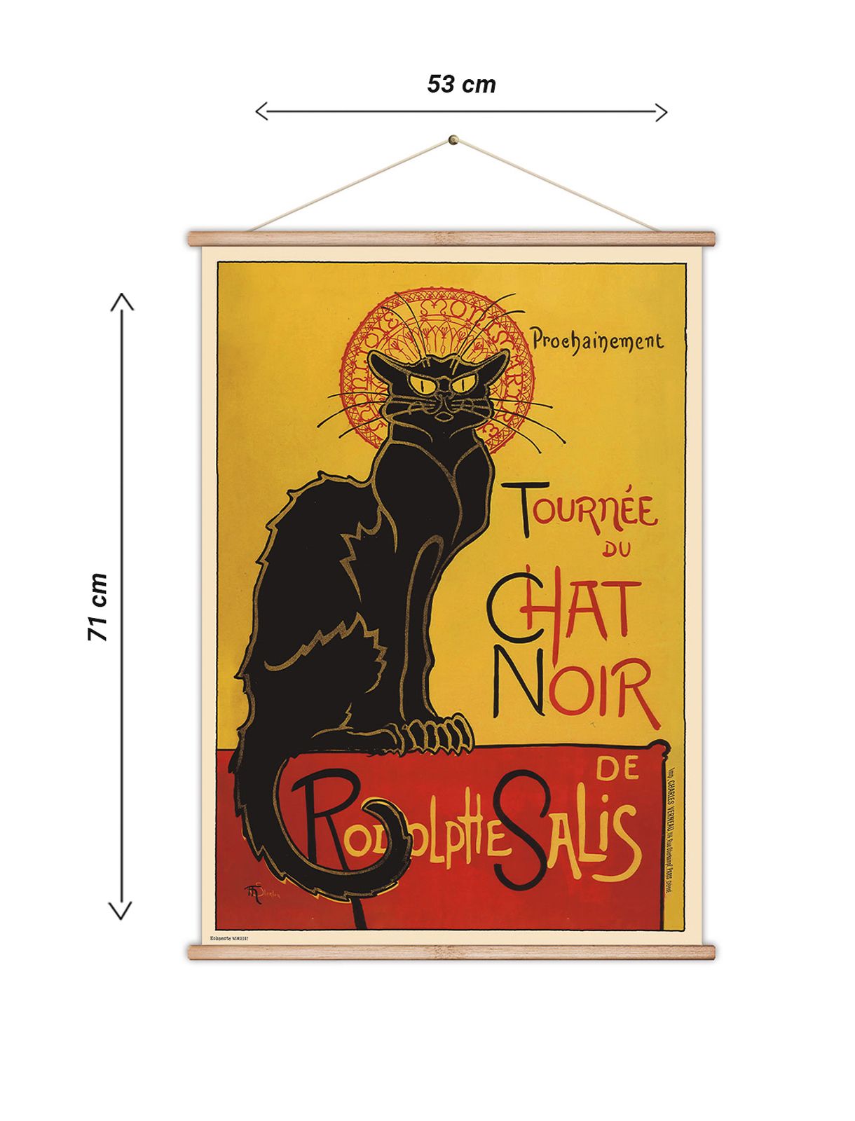 Banner dekoracyjny Le Chat Noir Przenieś się do Paryża końca XIX wieku z banerem Le Chat Noir. Ten elegancki dodatek do wnętrza o wymiarach 71x53x1,7 cm wykonany z jedwabistej tkaniny i wykończony drewnem na górnym i dolnym brzegu, idealnie ozdobi każdą przestrzeń. W zestawie znajduje się sznurek do łatwego zawieszenia.