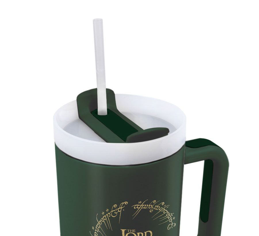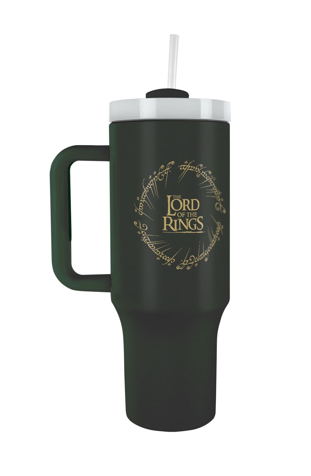 Lord Of The Rings Elvish Inscription - kubek termiczny z uchem 1140 ml Oficjalny kubek termiczny Lord Of The Rings Elvish Inscription o pojemności 1140 ml to praktyczny i stylowy gadżet dla fanów Śródziemia. Wyposażony w podwójne ścianki, ergonomiczne ucho i szczelną zakrętkę. Ozdobiony złotym elfickim napisem z Jedynego Pierścienia idealny do codziennego użytku i jako element kolekcji. Szczegóły techniczne: Pojemność: 1140 ml Izolacja: Podwójne ścianki Materiał: Tworzywo sztuczne Motyw: Elvish Inscription z Władcy Pierścieni Licencjonowany produkt Oryginalny produkt Władca Pierścieni. Świetny wybór do oferty prezentowej i codziennego użytku.