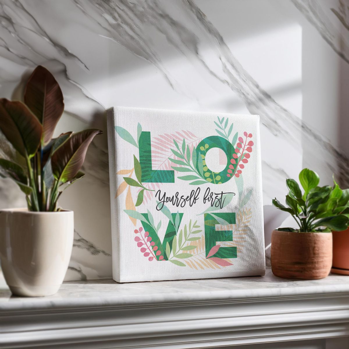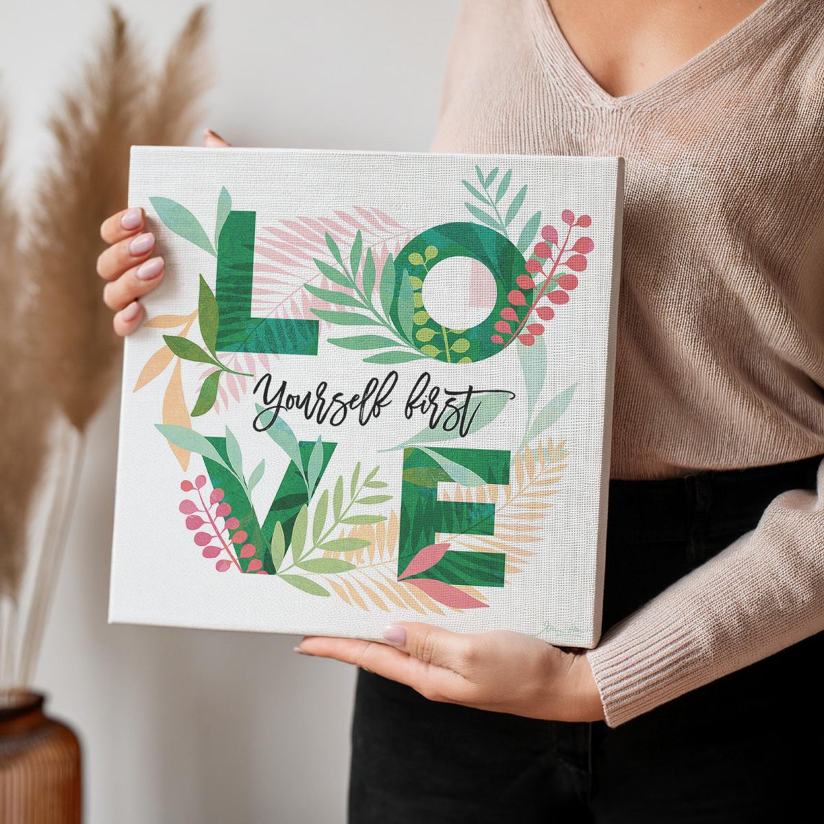 "Love Yourself First" to piękny obraz, który zachęca do dbania o siebie. Słowo "LOVE" otoczone zielonymi liśćmi i kwiatami tworzy subtelną i motywującą kompozycję. Jasne pastelowe kolory dodają wnętrzu świeżości i lekkości, wprowadzając pozytywny nastrój. Wykonany techniką akrylu na płótnie, obraz charakteryzuje się trwałością i głębią kolorów. Idealny do nowoczesnych wnętrz, gdzie wniesie pozytywną energię i elegancję. Produkt jest oryginalny i posiada licencję producenta, co potwierdza jego wysoką jakość i unikalność. Stylowy obraz wydrukowany na grubym bawełnianym płótnie. Krosna wykonane są z sosnowego drewna co stanowi solidną i efektowną całość. Zakupiony obraz jest gotowy do powieszenia na ścianie. Nasze produkty wykonywane są z dużą starannością oraz dbałością o szczegóły. Obraz posiada zadrukowane boki co gwarantuje estetyczne wykończenie bez konieczności dodatkowego oprawiania go.Obraz jest ostry a barwy nasycone. Zadrukowane boki sprawiają, że nie ma powodu aby obraz dodatkowo oprawiać. Mocne, trwałe płótno o ciekawej fakturze. Naturalna blejtrama z sosnowego drewna.