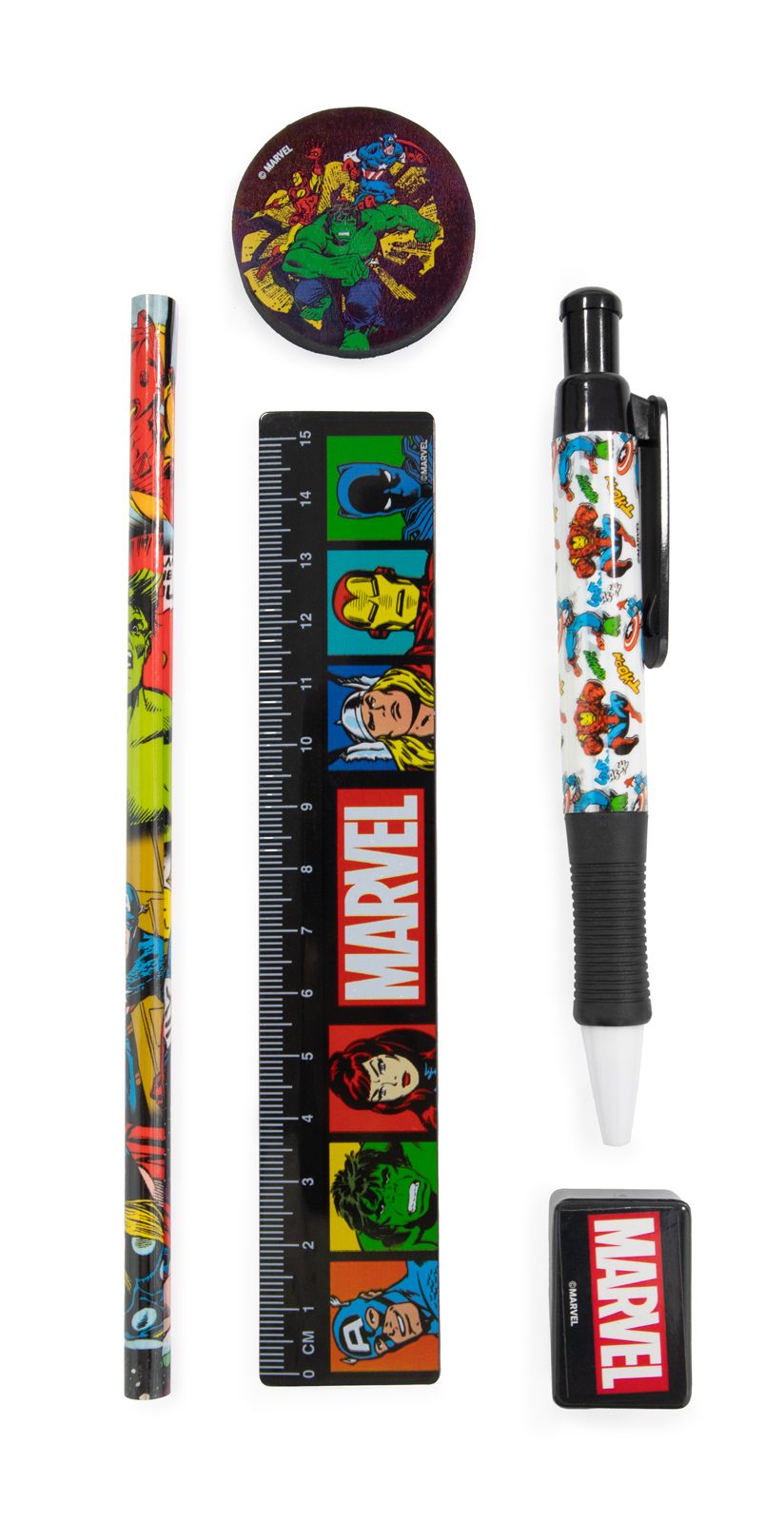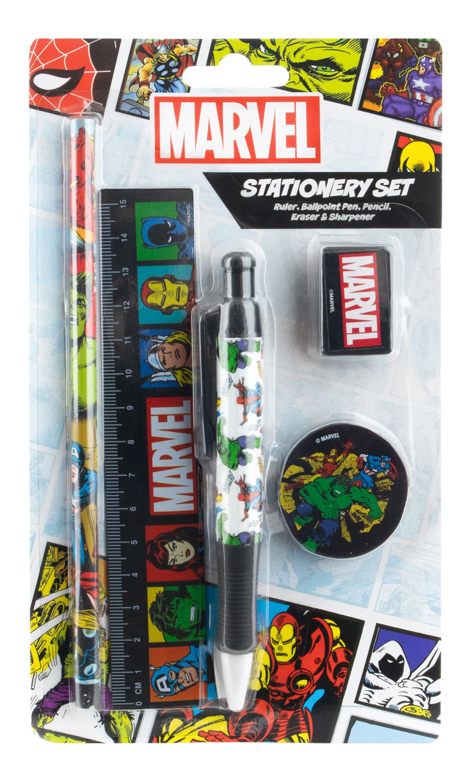Marvel Classic Comics - przybory szkolne Klasyczne motywy Marvela na przyborach szkolnych to coś, co z pewnością przypadnie do gustu młodym fanom superbohaterów. Zestaw zawiera długopis, ołówek, linijkę, temperówkę oraz gumkę do mazania, dzięki czemu doskonale sprawdzi się na co dzień w szkole. Każdy element zestawu jest ozdobiony wyrazistą grafiką przedstawiającą bohaterów z uniwersum Marvela, co nadaje mu wyjątkowy charakter. To świetny sposób, by zachęcić dzieci do nauki i odrabiania zadań domowych z przyjemnością. Szczegóły techniczne Zawartość: długopis, ołówek, linijka, temperówka, gumka do mazania Wymiary opakowania: 12,5x21,5 cm Licencjonowany produkt, który zapewnia wysoką jakość wykonania oraz trwałość grafik.