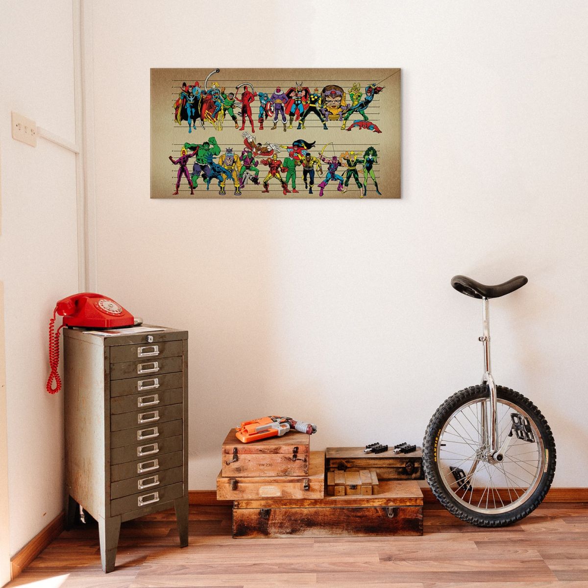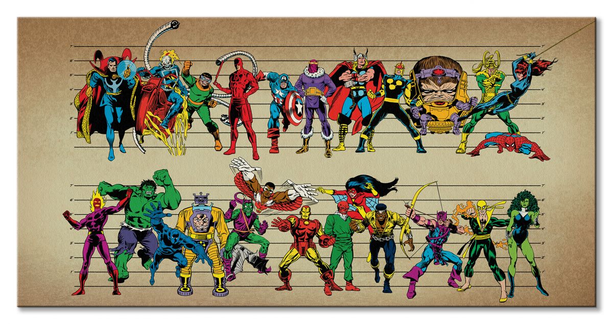 Obraz na ścianę noszący nazwę Marvel Comics (LIne Up). Szukasz oryginalnej, ekskluzywnej dekoracji na ścianę? Ten obraz jest dla Ciebie! trwałe kolory i fantastyczna jakość., obrazy charakteryzuje wysokie nasycenie barw i ostrość, nie sposób oderwać od nich wzrok. Kolory utrzymują się przez długie lata. Bawełniane płótno wysokiej jakości gwarantuje świetne odwzorowanie i trwałość obrazu.