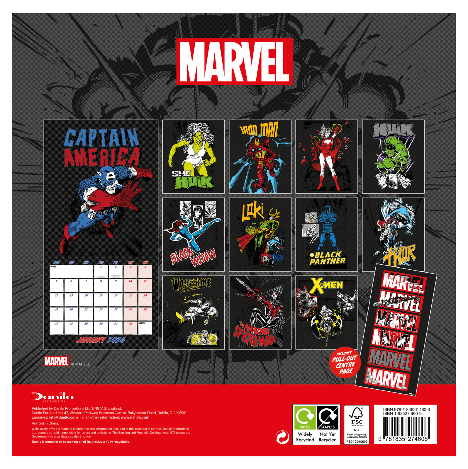 Marvel Comics oficjalny kalendarz na ścianę na 2026rok Oryginalny i licencjonowany kalendarz, posiada 12 rozkładanych stron o wymiarach 30x60 cm. Na każdej z kart znajduje się duża fotografiaoraz czytelne kalendarium z miejscem na notatki. W kalendarzu znajduje się 12 unikalnych zdjęć dla każdego miesiąca. Okładki wykonane są z papieru powlekanego matowego i laminowanego o gramaturze 250 g/m?, wnętrze z papieru powlekanego matowego o gramaturze 150 g/m?. Nagłówki są w języku angielskim. Oprawa zszywkowa. Złożony kalendarz 30x30 cm. Rozłożony kalendarz 30x60 cm. Zawiera otwór 5 mm do zawieszenia na ścianie.