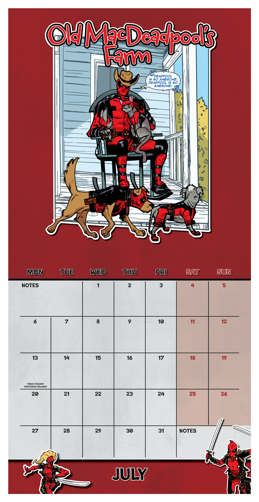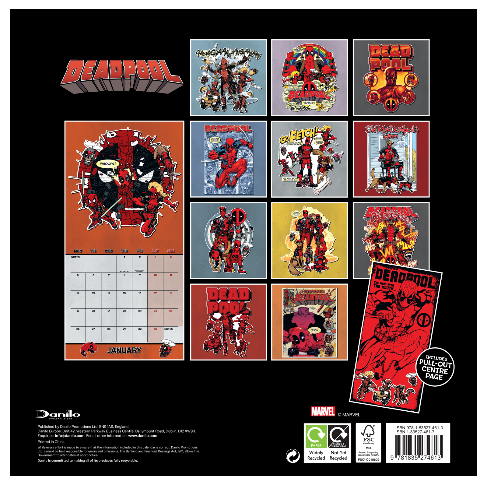 Marvel Deadpool oficjalny kalendarz na ścianę na 2026rok Oryginalny i licencjonowany kalendarz, posiada 12 rozkładanych stron o wymiarach 30x60 cm. Na każdej z kart znajduje się duża fotografiaoraz czytelne kalendarium z miejscem na notatki. W kalendarzu znajduje się 12 unikalnych zdjęć dla każdego miesiąca. Okładki wykonane są z papieru powlekanego matowego i laminowanego o gramaturze 250 g/m?, wnętrze z papieru powlekanego matowego o gramaturze 150 g/m?. Nagłówki są w języku angielskim. Oprawa zszywkowa. Złożony kalendarz 30x30 cm. Rozłożony kalendarz 30x60 cm. Zawiera otwór 5 mm do zawieszenia na ścianie.