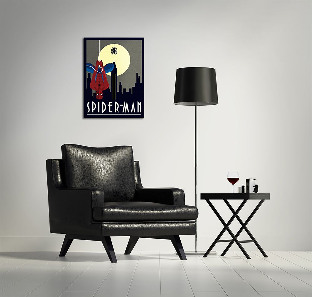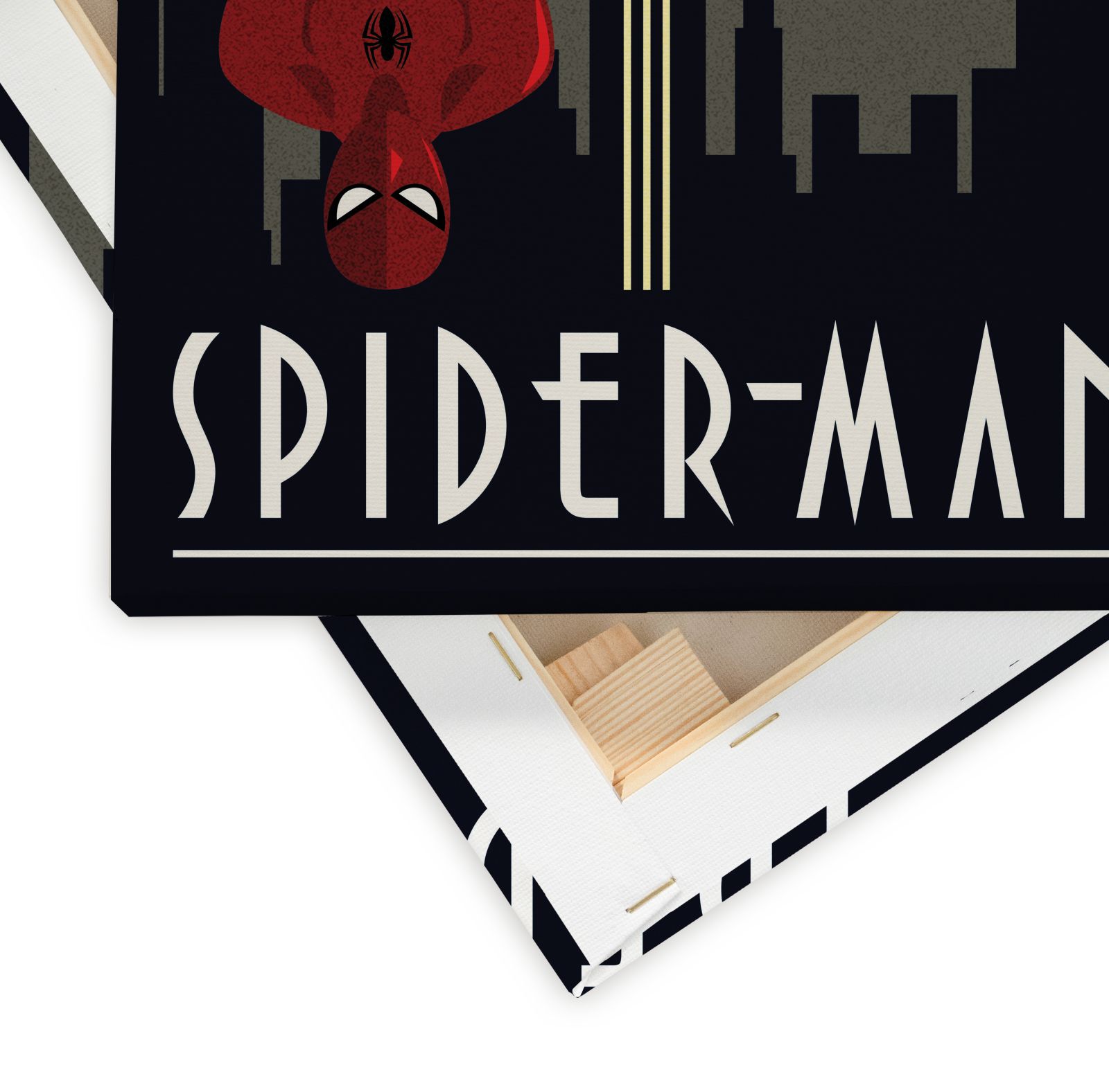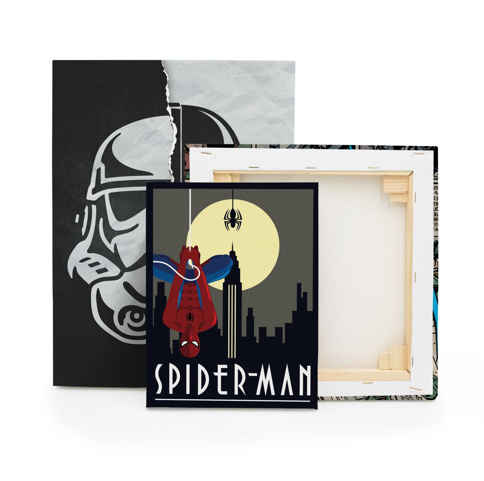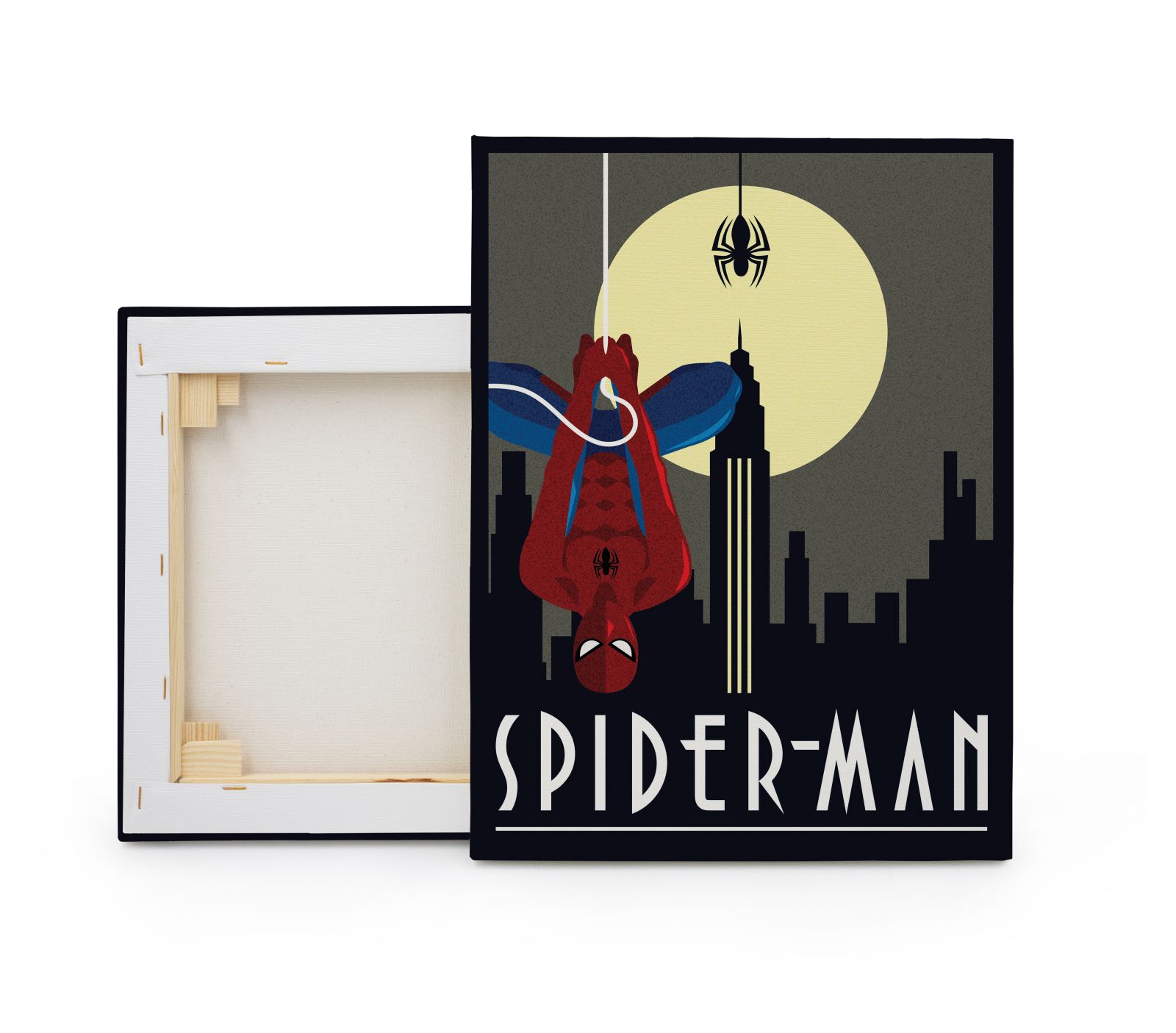 Obraz na ścianę noszący nazwę Marvel Deco (Spider-man Hanging). Autorstwa: nieznanego Szukasz oryginalnej, ekskluzywnej dekoracji na ścianę? Ten obraz jest dla Ciebie! fantastyczne kolory i rewelacyjna ostrość., obrazy charakteryzuje wysokie nasycenie barw i ostrość, nie sposób oderwać od nich wzrok. Kolory utrzymują się przez długie lata. Mocne bawełniane płótno wygląda naturalnie i oddaje charakter autentyczności obrazu.